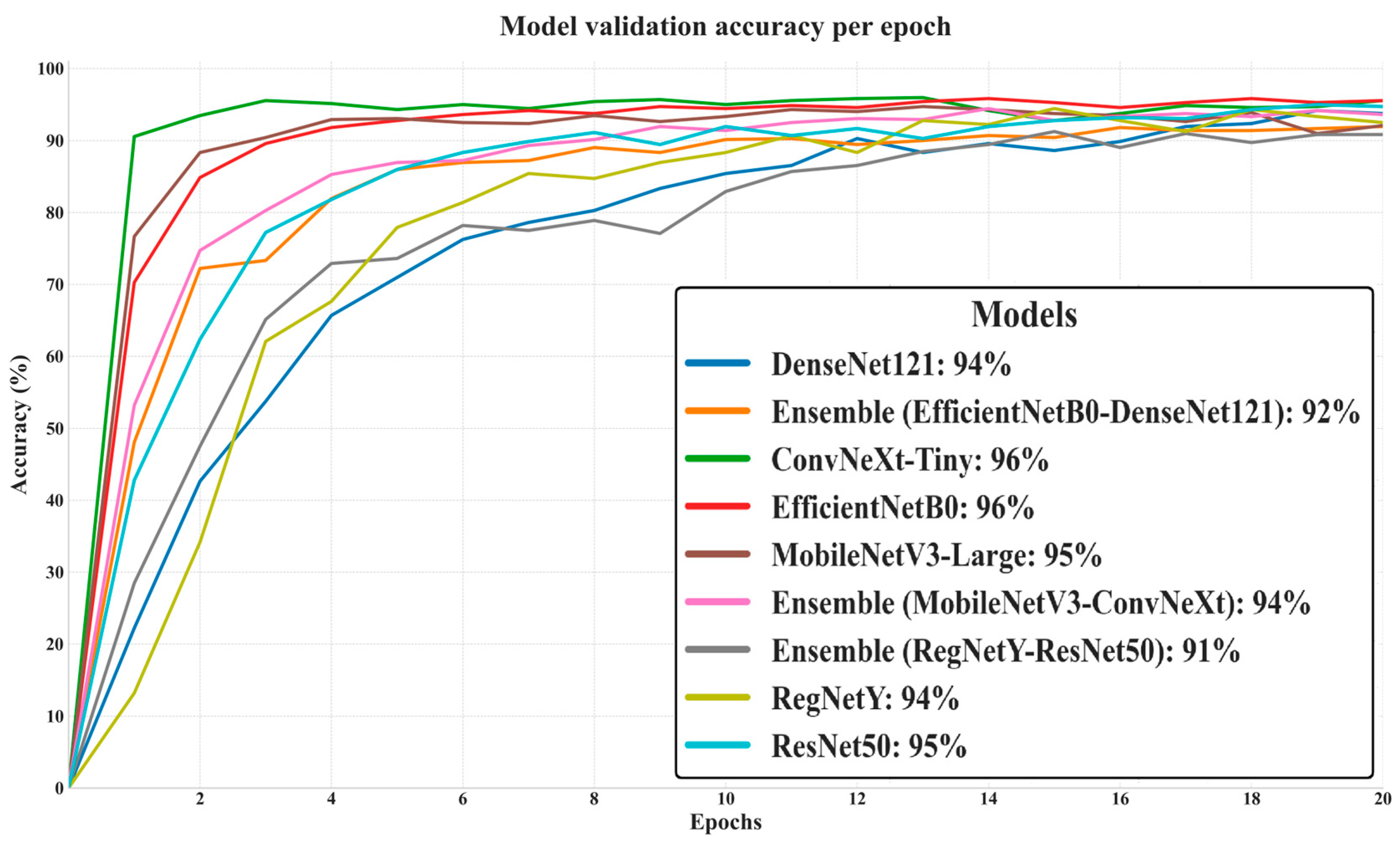 Figure 6 depicts the progression of validation accuracy across 20 epochs for all evaluated models, providing a clear picture of their generalization capabilities on unseen data. ConvNeXt-Tiny and EfficientNetB0 achieved the highest final validation accuracy (96%), closely followed by MobileNetV3-Large (95%) and ResNet50 (95%), indicating strong adaptability to the validation set without significant overfitting. DenseNet121 and Ensemble (MobileNetV3–ConvNeXt) both reached 94%, while RegNetY scored slightly lower at 94% and the Ensemble (EfficientNetB0–DenseNet121) trailed at 92%. The lowest performer was the Ensemble (RegNetY–ResNet50) at 91%, despite both of its constituent models individually achieving higher accuracy, suggesting that this pairing did not yield effective synergy. Notably, the curves show that top-performing models stabilized their validation accuracy earlier, reflecting efficient learning and robust feature extraction, while lower-performing ensembles displayed slower convergence and smaller final gains.