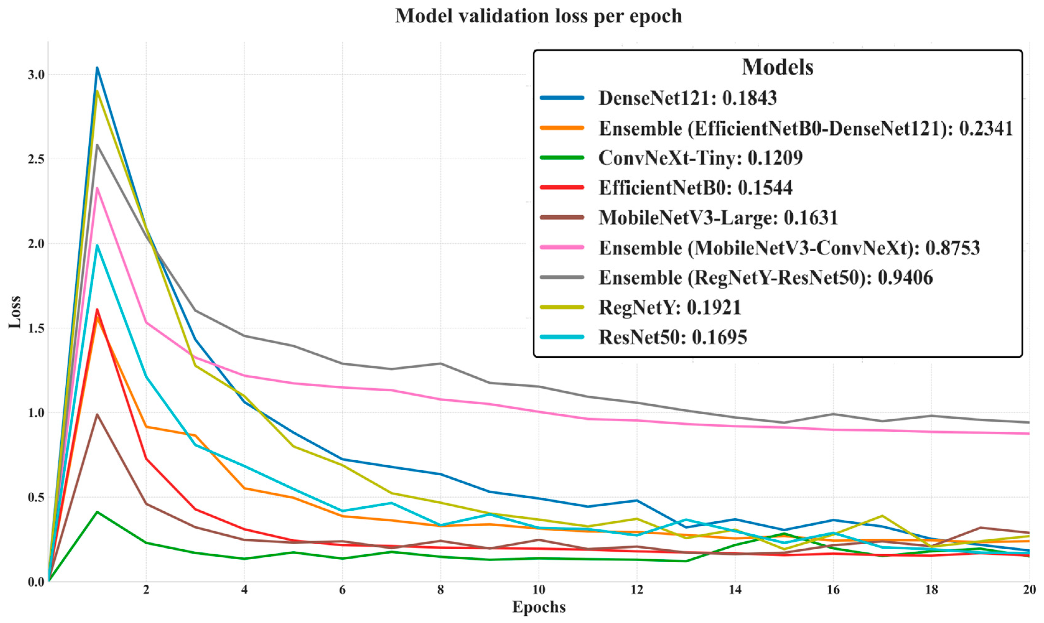 In contrast, DenseNet121 and Ensemble (EfficientNetB0–DenseNet121) exhibited slower accuracy growth, plateauing at lower final values (86% and 85%, respectively). This suggests that either their feature extraction capacity was less aligned with the dataset’s complexity or that over-regularization limited their ability to fully fit the training data. RegNetY and ResNet50 demonstrated moderate convergence speeds, reaching 89% and 91% accuracy, respectively, while Ensemble (RegNetY–ResNet50) and Ensemble (MobileNetV3–ConvNeXt-Tiny) attained intermediate results (90% and 93%). The performance gap between some ensembles and their best-performing individual members indicates that the integration did not always lead to improved training accuracy, likely due to overlapping feature representations rather than complementary ones.