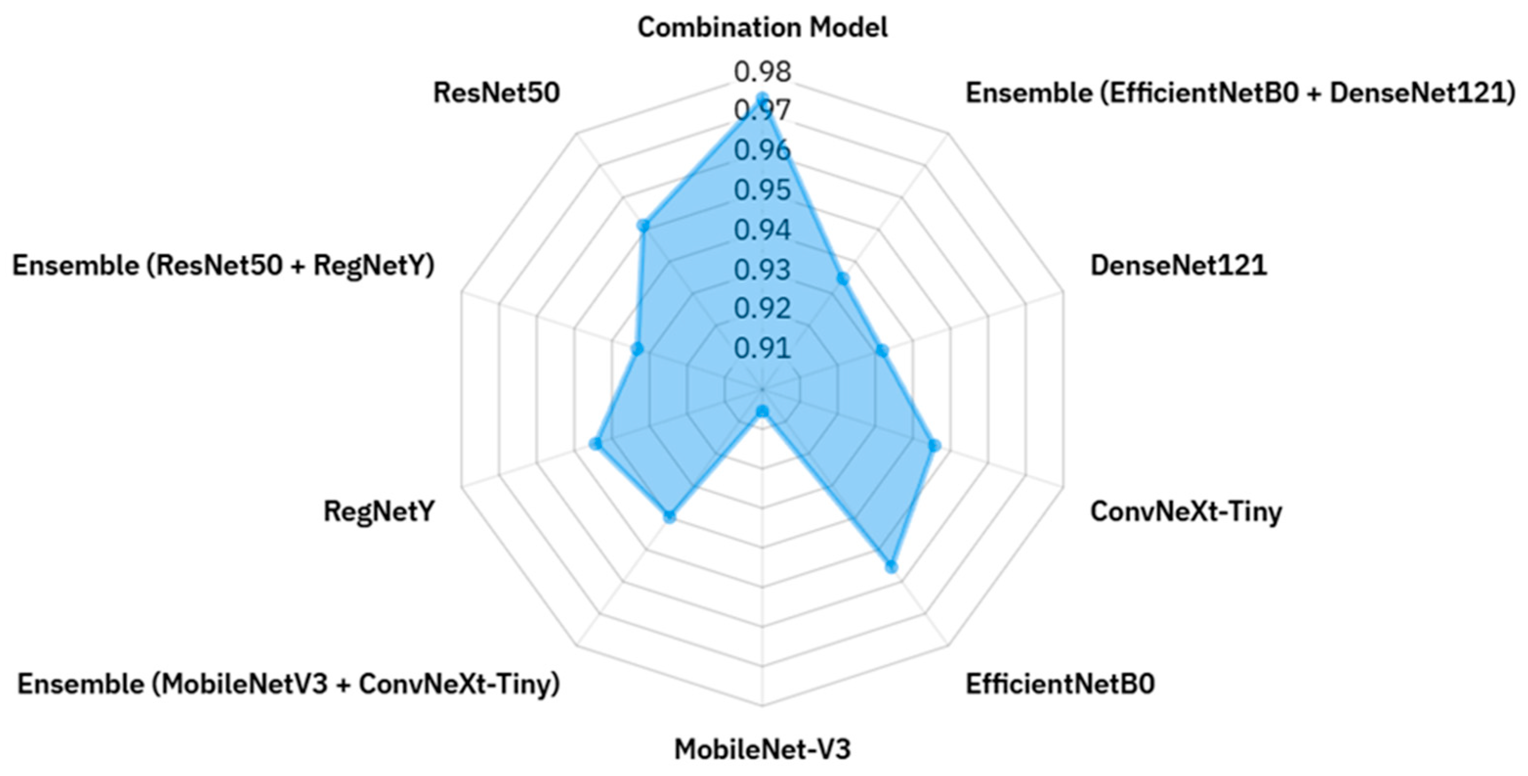 Figure 9 offers a clear and compact visualization of the accuracy values for all evaluated models, enabling an intuitive comparison of their relative performance within a single plot. Each axis corresponds to a different model, and accuracy values are plotted radially outward from the center, with models closer to the edge representing higher classification performance. The polygon formed by connecting these points highlights both the best-performing models and the overall distribution of results across the architectures. It is evident that the Combination Model achieves the highest accuracy (0.9736), occupying the outermost position and surpassing all individual and ensemble configurations. EfficientNetB0 and ConvNeXt-Tiny also extend toward the upper radial range, indicating strong standalone performance, while other architectures such as DenseNet121 and ResNet50 maintain competitive yet slightly lower accuracy. Interestingly, certain ensemble configurations, such as EfficientNetB0 + DenseNet121 and RegNetY + ResNet50, are positioned closer to the center, revealing that combining models does not always guarantee improved accuracy. In contrast, lightweight architectures like MobileNetV3 demonstrate respectable accuracy but remain behind the top performers, reflecting their inherent trade-off between computational efficiency and representational capacity. Overall, this radar chart not only facilitates rapid side-by-side comparison but also exposes performance patterns and asymmetries, making it a valuable tool for identifying architectures with the greatest potential and those requiring further optimization in macrofungi classification tasks.