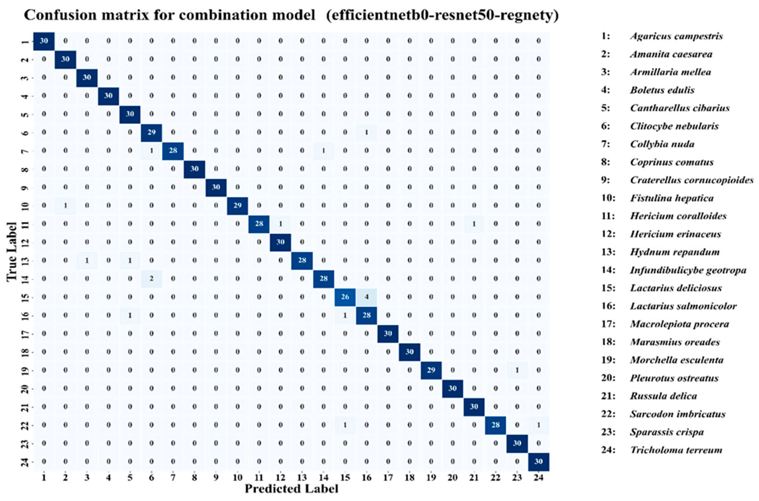 Figure 10 for the combination model (EfficientNetB0–ResNet50–RegNetY), provides a detailed overview of the classification performance across the 24 wild edible macrofungi species in the dataset, highlighting both correct predictions and misclassifications. The strong diagonal dominance indicates that the majority of samples for each class were correctly identified, with most categories achieving perfect classification (30/30 correct predictions) or near-perfect accuracy. For instance, species such as