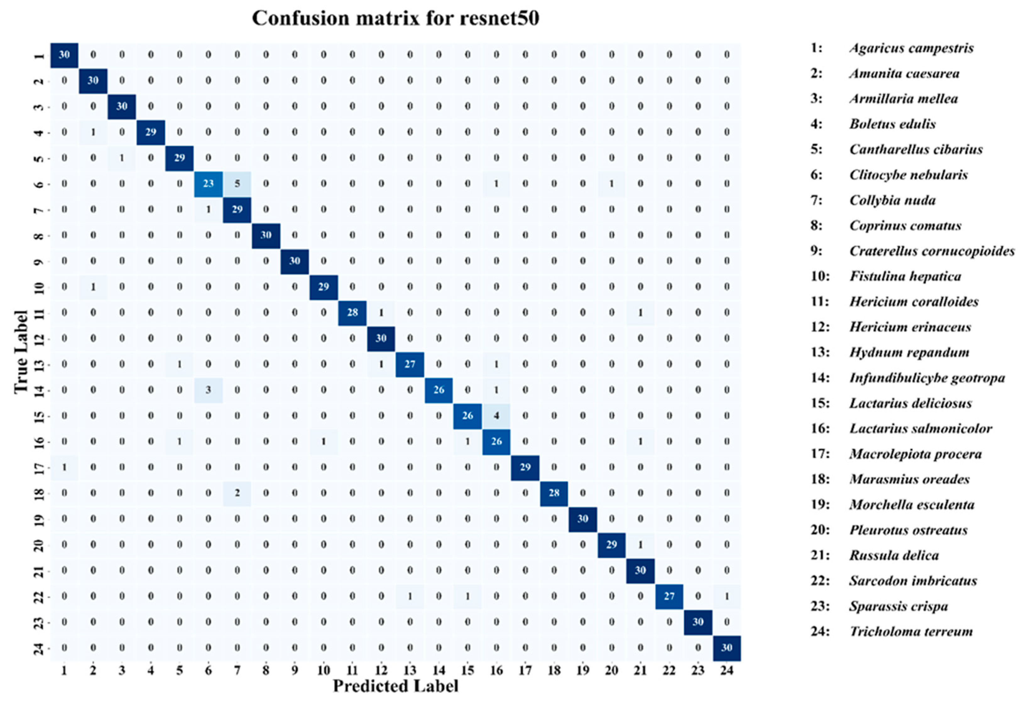 Sparassis crispa, reached perfect accuracy (30/30 correct classifications). However, compared to the combination model (EfficientNetB0–ResNet50–RegNetY), ResNet50 exhibits a higher number of misclassifications, particularly for classes such as