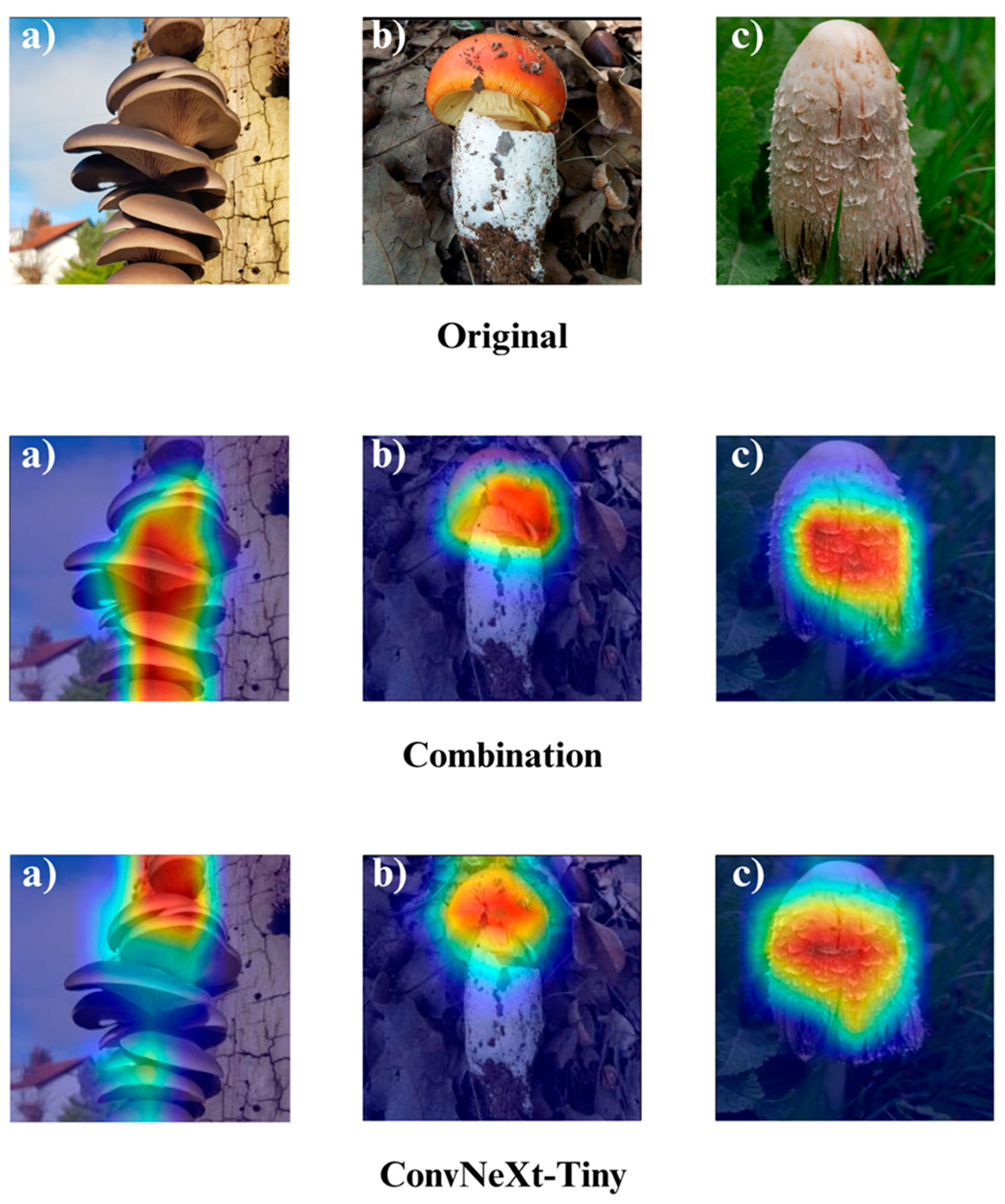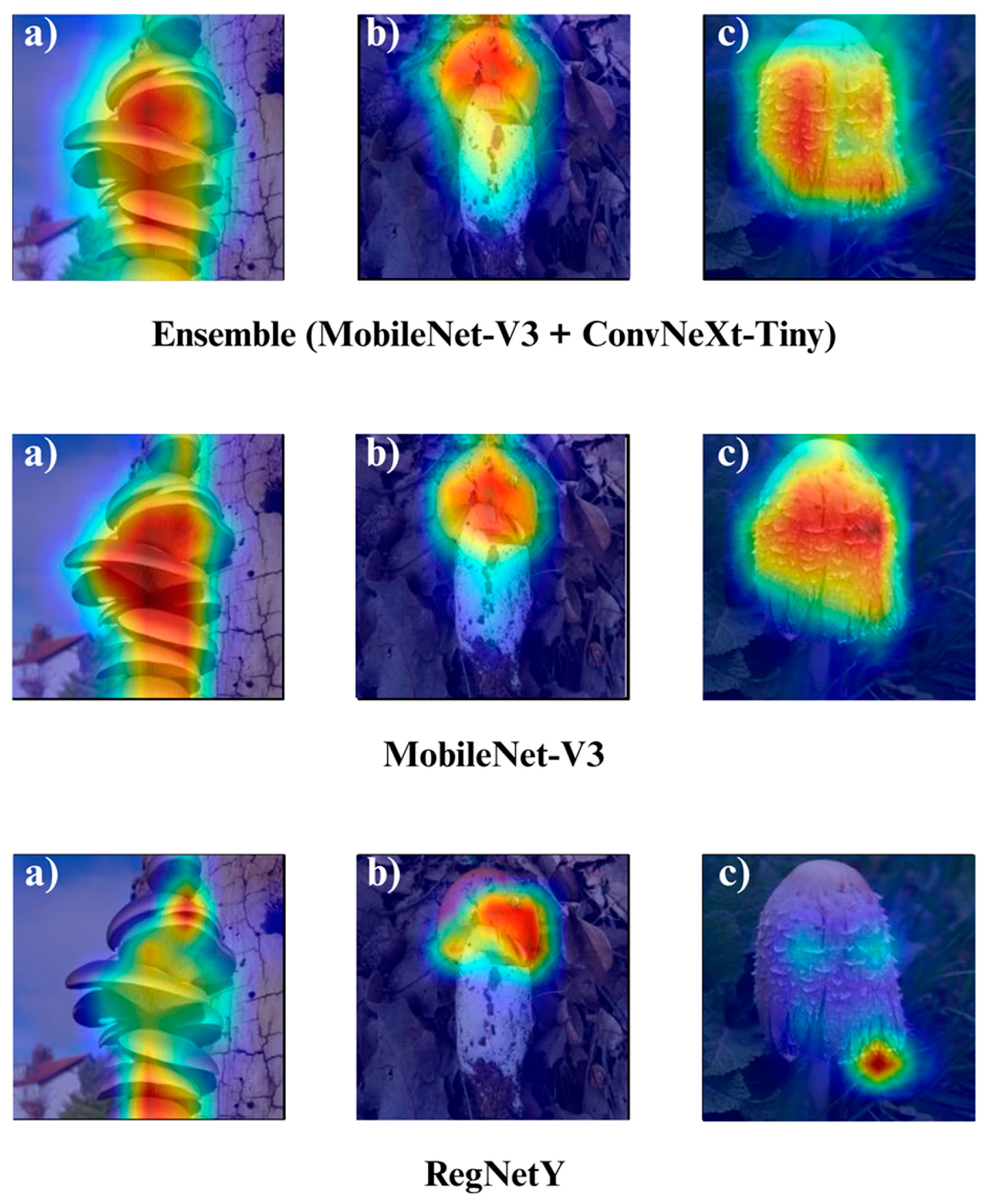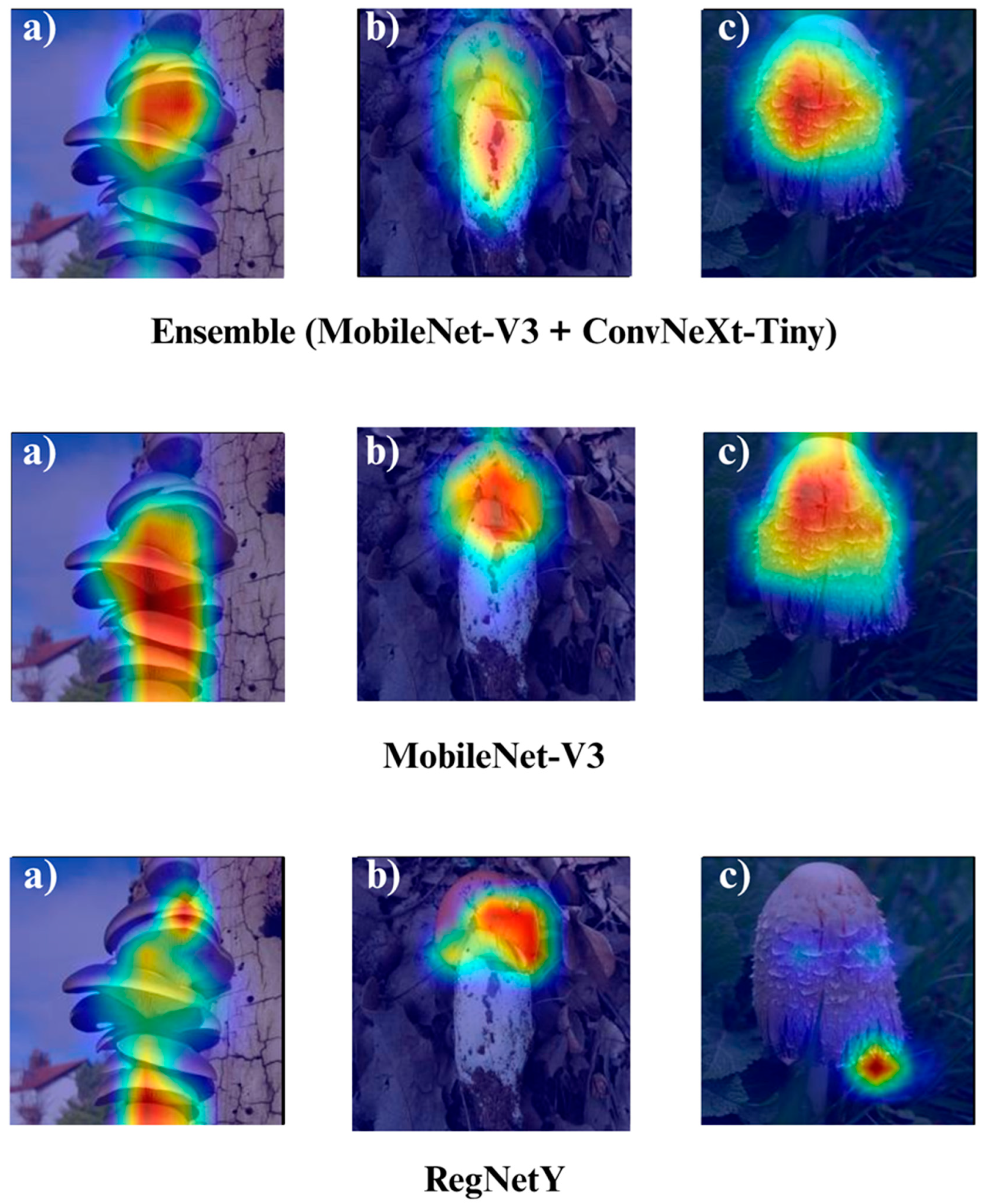 Figure 15) clearly demonstrate the critical regions that each model focuses on during macrofungi classification. All models exhibit strong activation in distinctive morphological areas such as the cap, gills, and stem, effectively capturing the key visual cues necessary for accurate classification. The single models (DenseNet-121, EfficientNet-B0, MobileNet-V3, ConvNeXt-Tiny, ResNet50, RegNetY) show robust localization capabilities, highlighting the unique structural features of each mushroom species. However, in some single models, there are instances of limited focus areas or slight deviations from the most relevant regions. In contrast, the ensemble models, particularly the Combination Model, generate broader and more intense activation regions, ensuring that visual information is captured more comprehensively and consistently. This demonstrates that combined models can leverage the strengths of different architectures to extract deeper and more context-aware features.