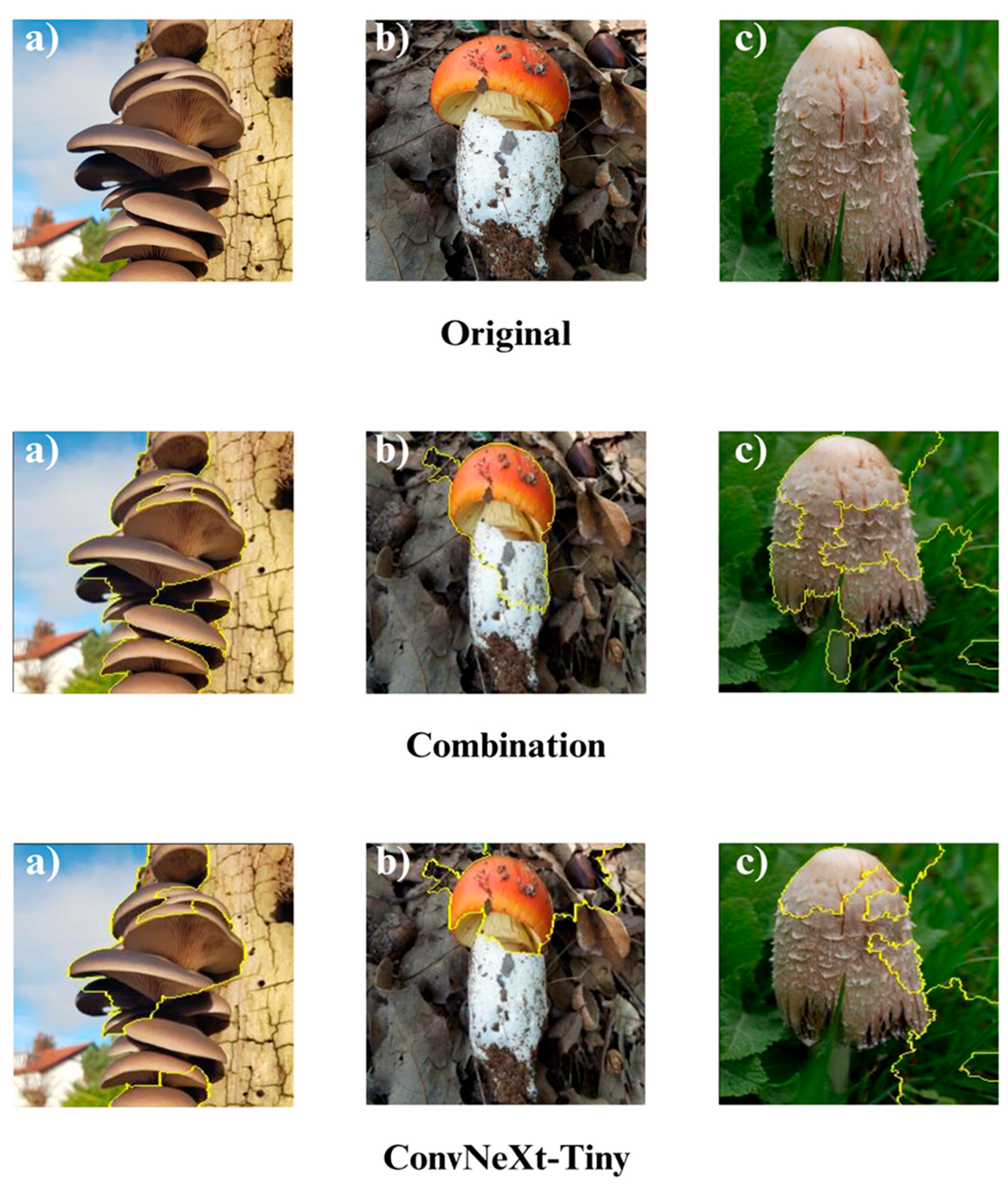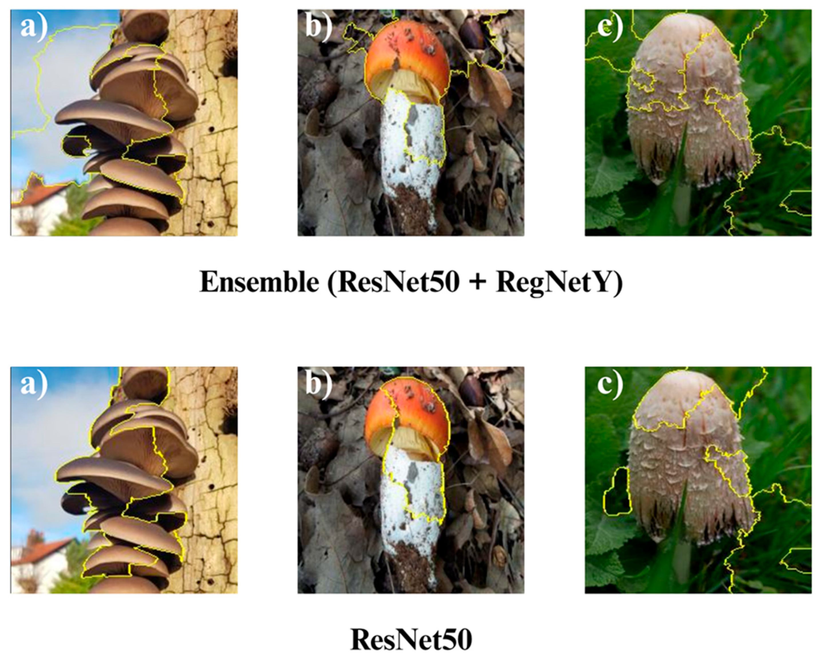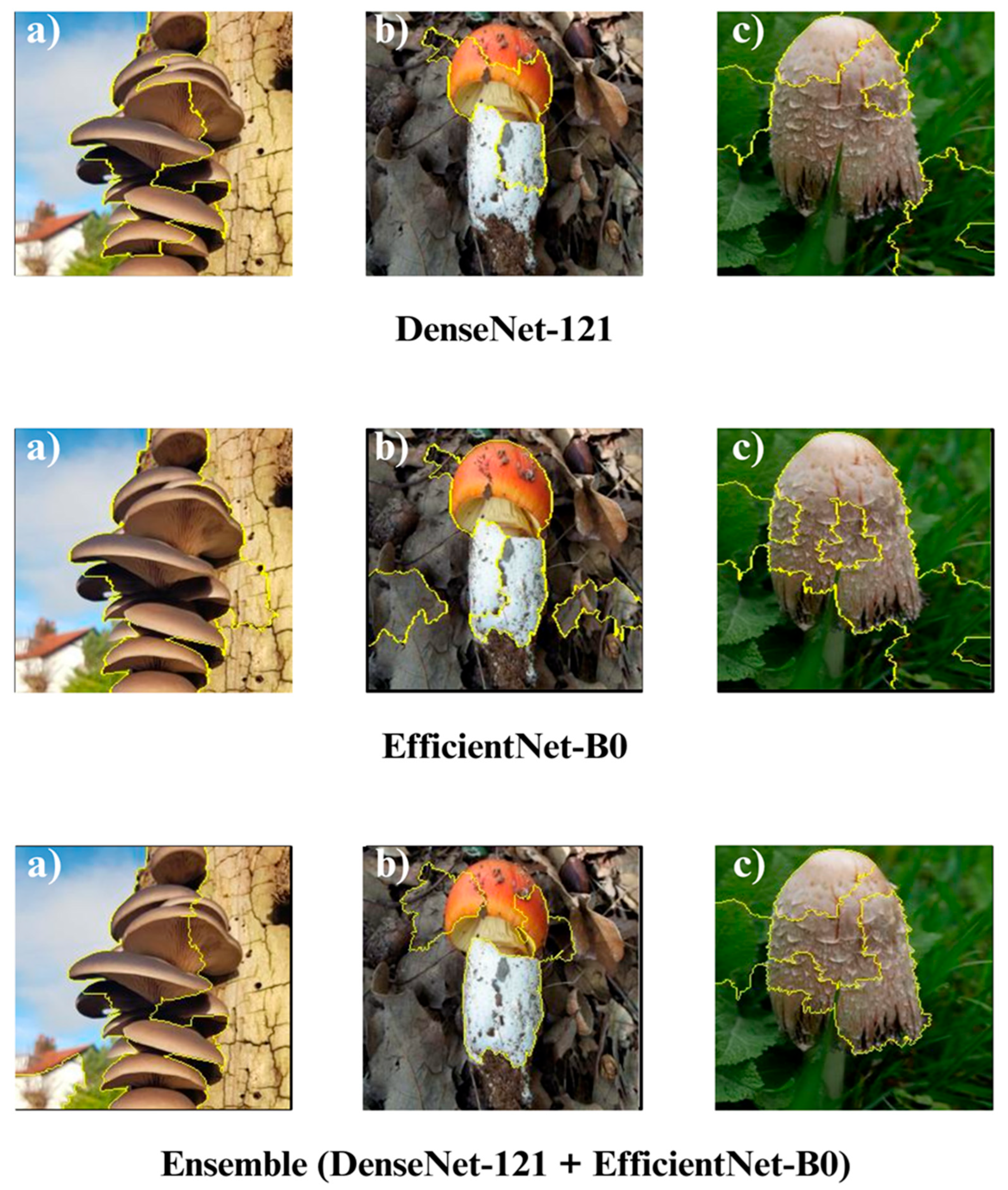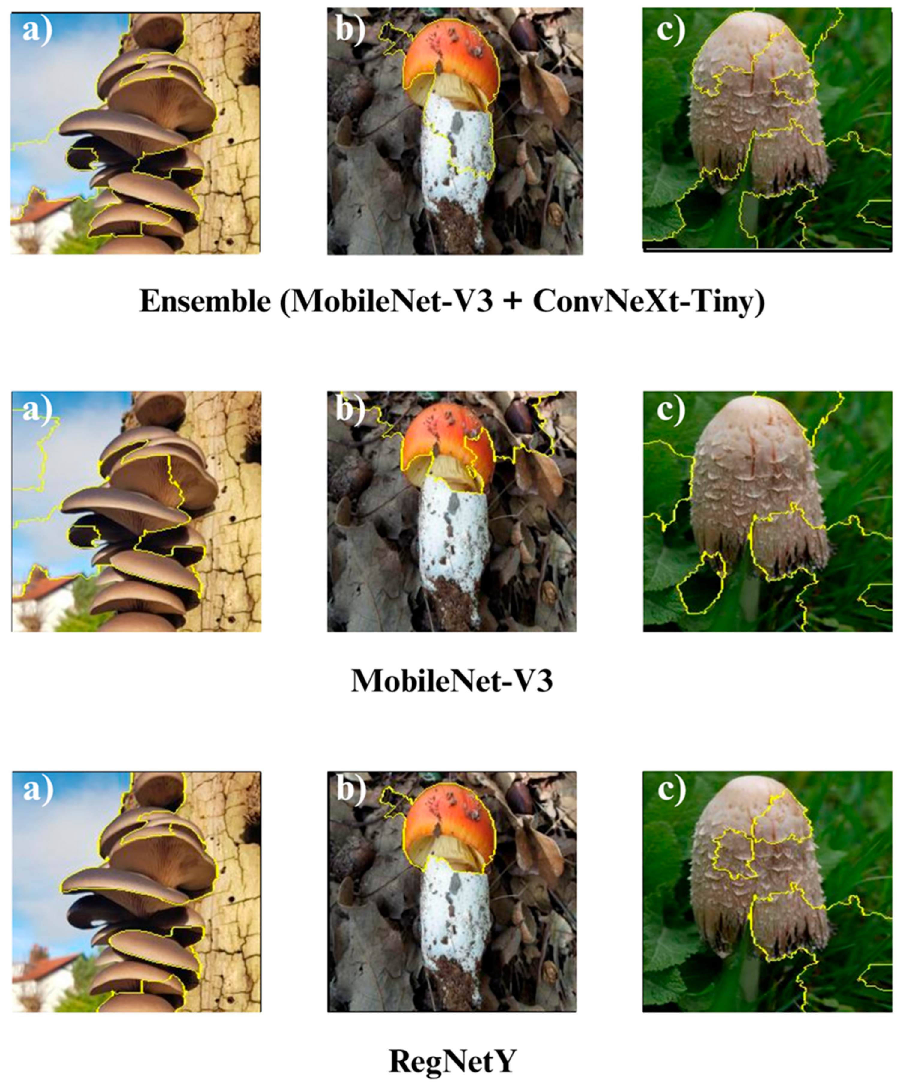 When comparing the models, the combination (ensemble) approaches consistently yielded more coherent and semantically relevant superpixel maps than their single-model counterparts. The ensemble methods leveraged complementary feature extraction capabilities, reducing noise in the highlighted regions and ensuring that attention was directed toward biologically significant structures rather than irrelevant background patterns. This fusion of strengths from multiple architectures not only enhanced classification accuracy but also improved interpretability, as the highlighted superpixels more faithfully aligned with expert-defined diagnostic regions in the mushroom images. Among the evaluated models, combinations such as DenseNet121 + EfficientNet-B0, MobileNet-V3 + ConvNeXt-Tiny, and ResNet50 + RegNetY demonstrated particularly strong localization accuracy, suggesting that multi-model integration can meaningfully enhance both predictive and explanatory performance.