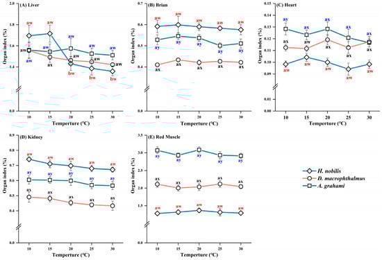 Organ indices of H. nobilis, D. macrophthalmus, and A. grahami tissues. The data are expressed as the means ± SEs, n = 12; a and b indicate significant differences between temperatures (p < 0.05); w, x, and y indicate significant differences between species (p < 0.05).