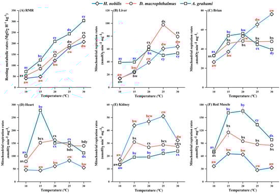 Effects of temperature on the RMRs and mitochondrial respiration rates of H. nobilis, D. macrophthalmus, and A. grahami. (A): the resting metabolic rates, n = 6; (B–F): the mitochondrial respiration rates in the tissues, n = 4. The data are presented as the means ± SEs; a–e indicate significant differences between temperatures (p < 0.05); w–y indicate significant differences between species (p < 0.05).
