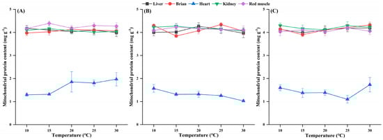 Under each temperature treatment, the mitochondrial protein content did not differ significantly among the three species (Table A1 and Table A2). The heart mitochondrial protein content was significantly lower than that in other tissues but not different from that in other tissues (Figure 4).