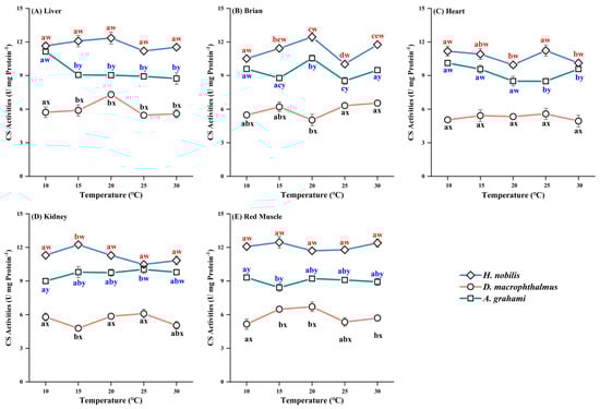 Effects of temperature on CS activity in the tissues of H. nobilis, D. macrophthalmus, and A. grahami. The data are expressed as the means ± SEs, n = 3; a–e indicate significant differences between temperatures (p < 0.05); w–y indicate significant differences between species (p < 0.05).