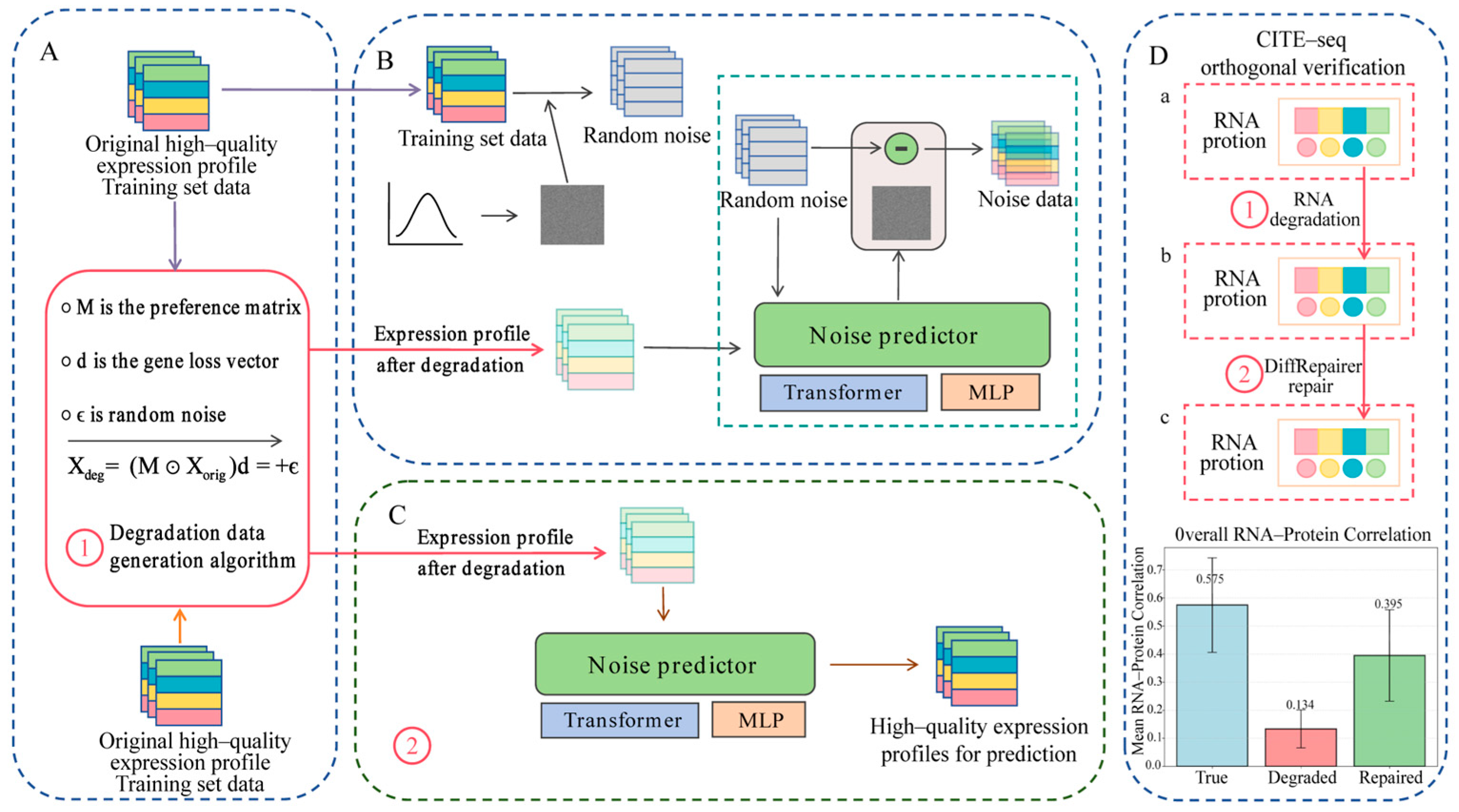 Figure 1. Conceptual framework and workflow of the DiffRepairer model. (A) Data preparation stage: paired pseudo-degraded samples are generated from high-quality reference data using a degradation simulation algorithm that models 3′ bias (M), gene dropout (d), and technical noise ( ϵ ). (B) Training stage: the model learns to predict the noise component by taking both the degraded expression profile ( X d e g ) and a noisy version of the original data as inputs, using a Transformer-based Noise Predictor architecture. (C) Inference stage: the trained model performs one-step repair by taking only the degraded expression profile ( X d e g ) as input and directly outputs the repaired high-quality expression profile, without requiring random noise or iterative sampling. (D) Application validation: CITE-seq orthogonal verification demonstrates that the model effectively restores RNA-protein correlation from degraded samples. The workflow compares RNA-protein correlations across (a) original, (b) degraded (step ①), and (c) repaired (step ②) states.