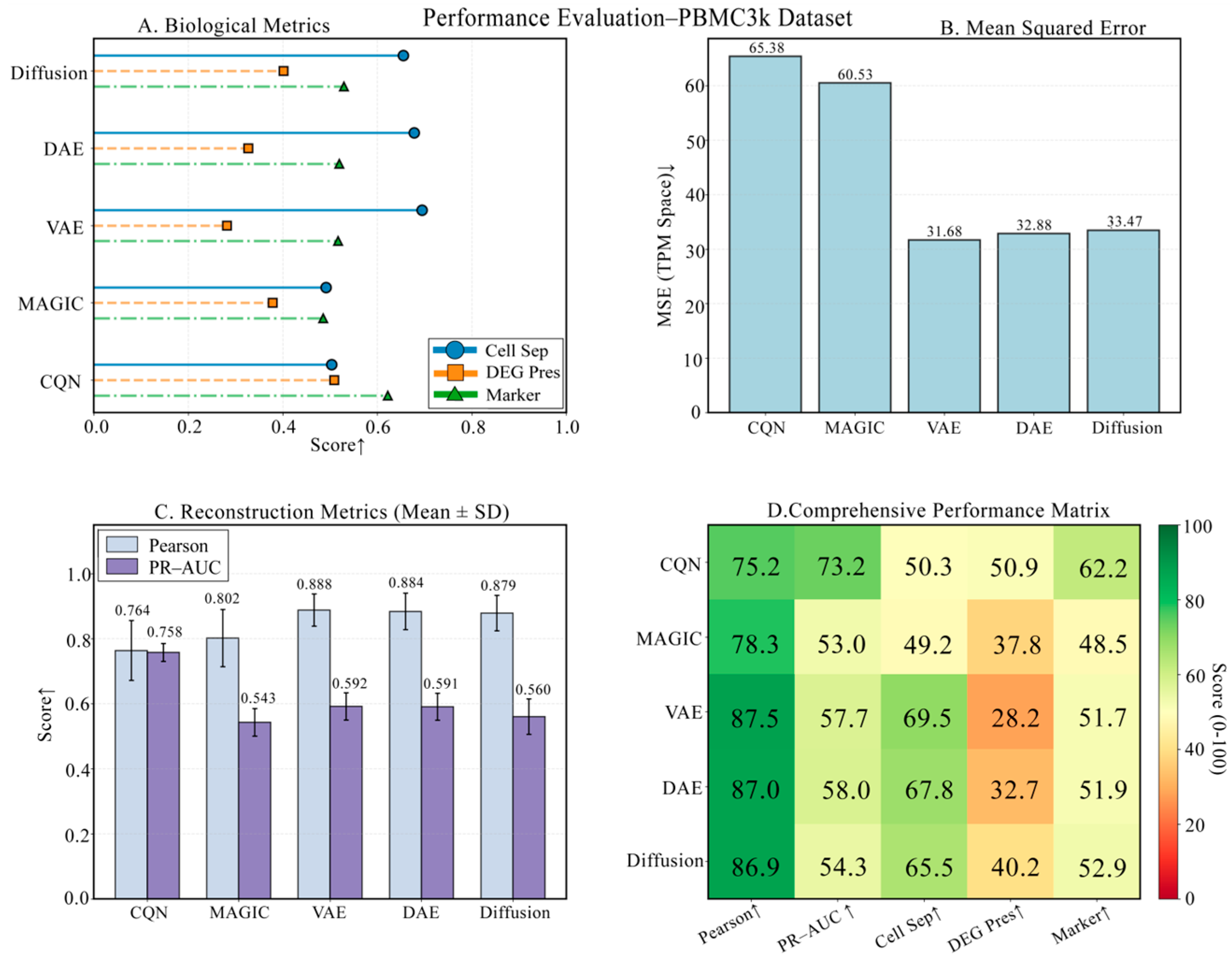 Figure 2. Comprehensive performance evaluation on the benchmark PBMC3k dataset. (A) Scores of each model on three core biological metrics. (B) Mean Squared Error (MSE) of each model. (C) Pearson Correlation and PR-AUC of each model. (D) A comprehensive performance heatmap summarizing all key metrics. Arrows indicate whether higher (↑) or lower (↓) values represent better performance.
