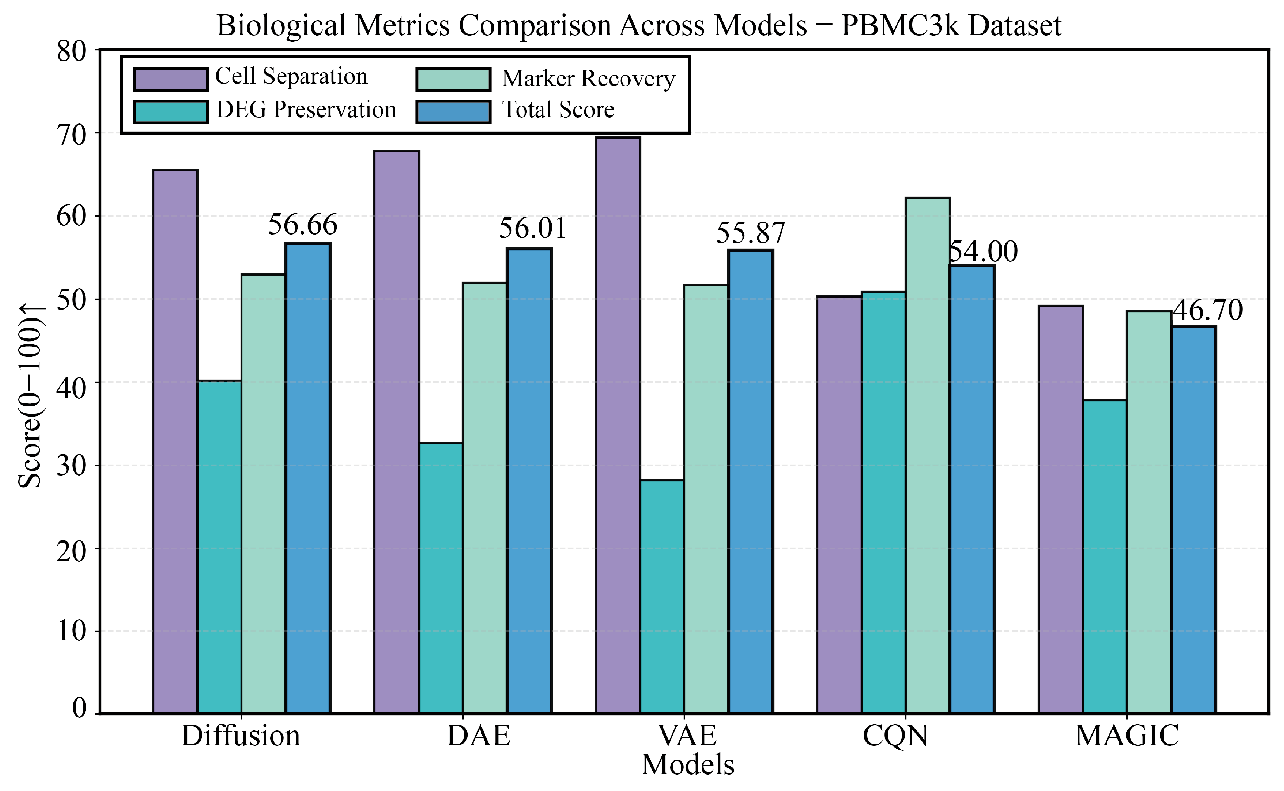 Figure 3. Detailed comparison of biological performance on the PBMC3k dataset. This figure details the comparison of five methods (DiffRepairer, DAE, VAE, CQN, MAGIC) across four key biological metrics (Cell Type Separation, DEG Preservation, Marker Gene Recovery, and Overall Score). The results highlight the severe deficiency of DAE and VAE in DEG Preservation, while DiffRepairer achieved the highest overall biological score due to its balanced performance. The arrow (↑) indicates that higher scores represent better performance.