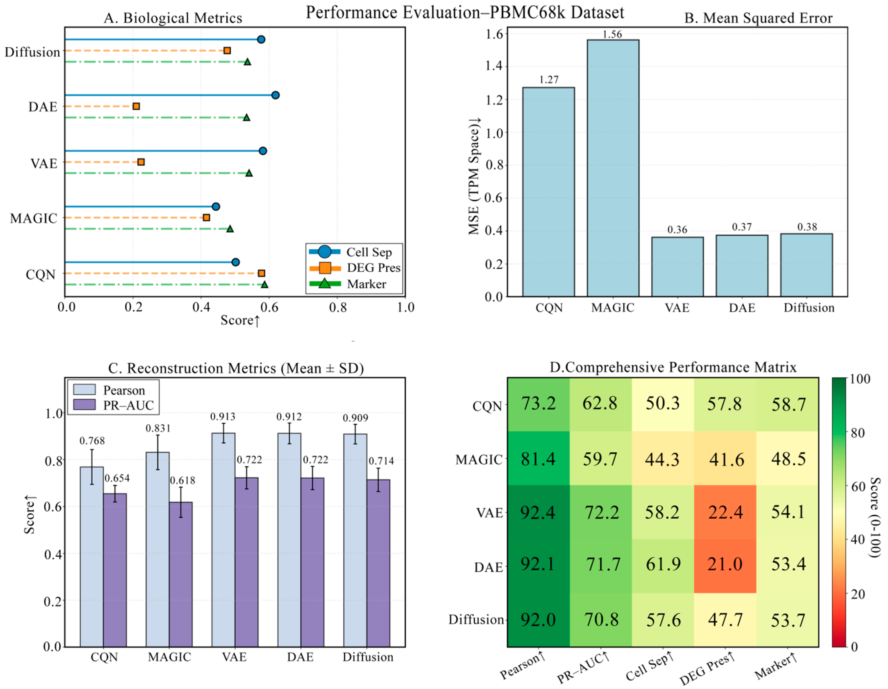 Figure 4. Performance robustness validation on the PBMC68k dataset. (A) Biological metric scores. (B) Mean Squared Error (MSE). (C) Reconstruction metrics. (D) Comprehensive performance heatmap. The results demonstrate that DiffRepairer’s performance remains robust and superior on a larger dataset. Arrows indicate whether higher (↑) values represent better performance.