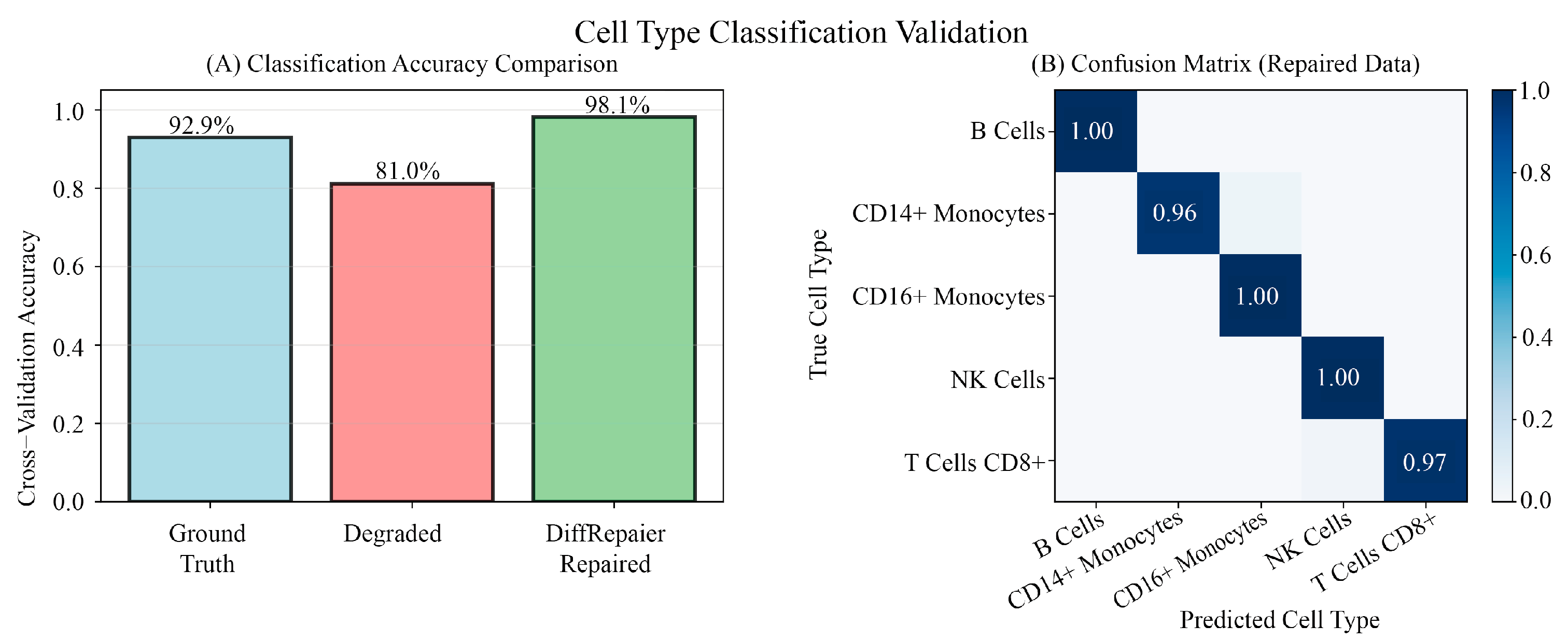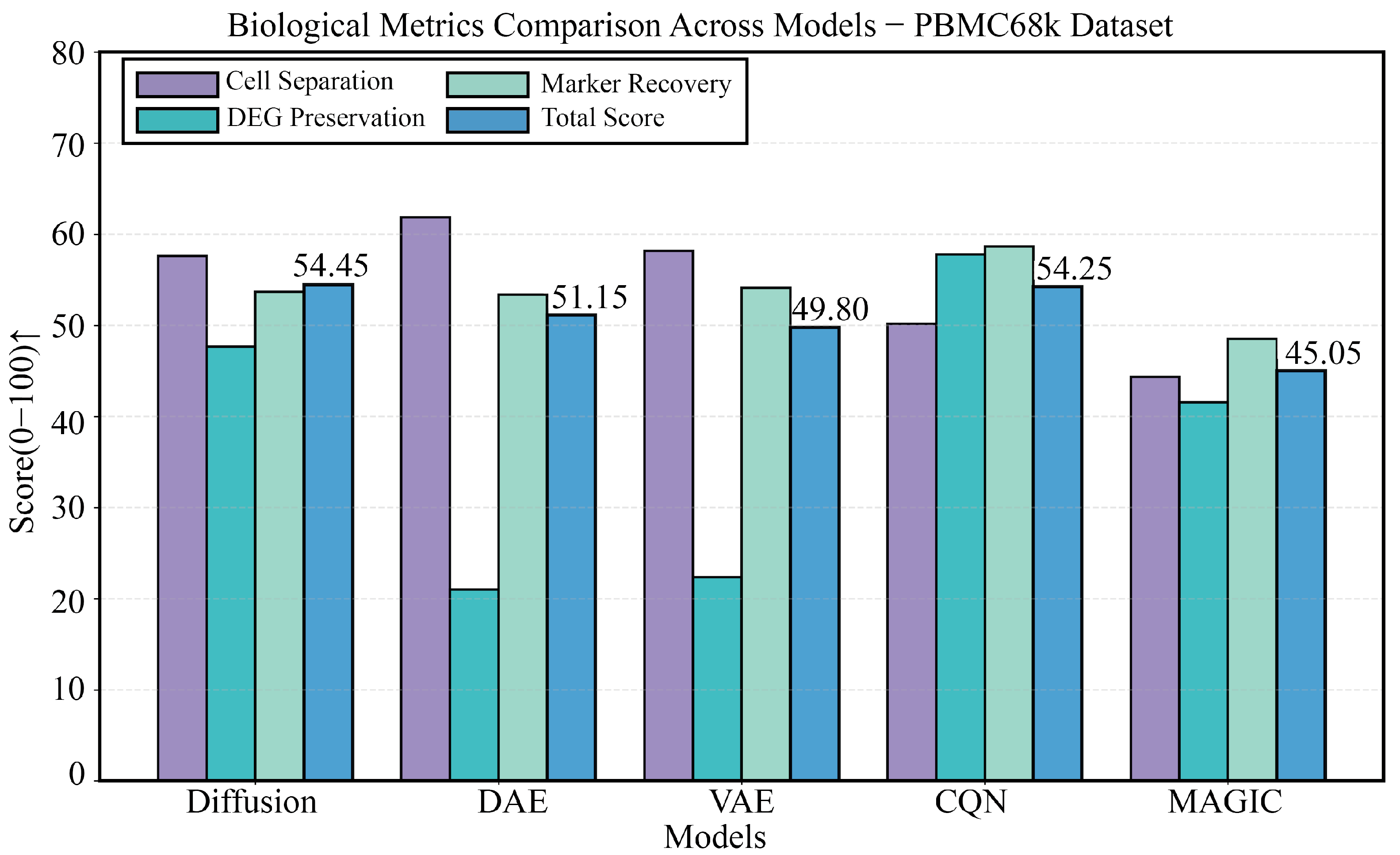 Figure 5. Detailed comparison of biological performance on the PBMC68k dataset. This figure provides a detailed comparison of the five methods across four key biological metrics. The results clearly reveal the exacerbated “over-smoothing” issue of DAE and VAE when handling more complex data, with their DEG preservation scores being significantly lower than other methods. In contrast, DiffRepairer performed robustly and achieved the highest overall biological score. The arrow (↑) indicates that higher scores represent better performance.