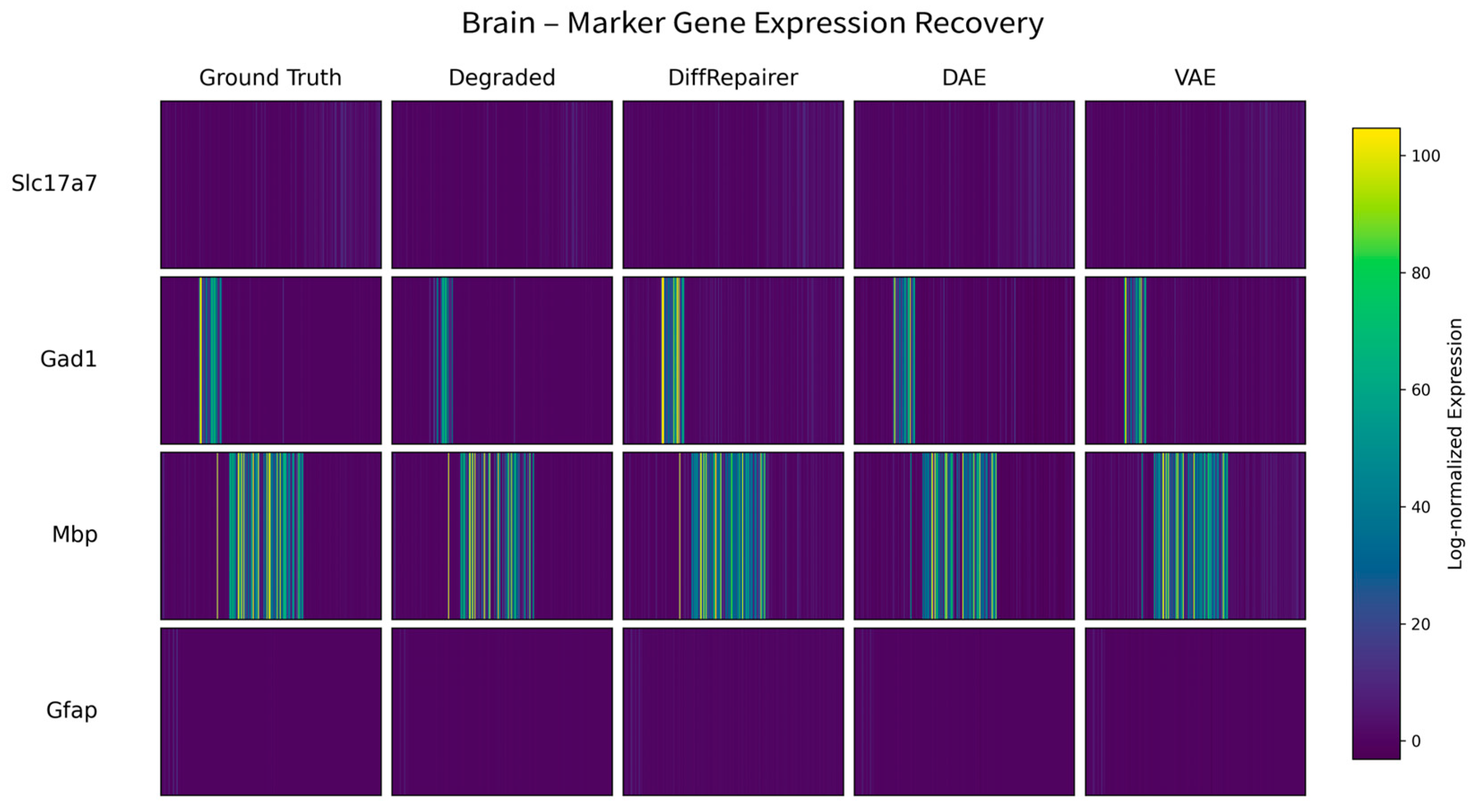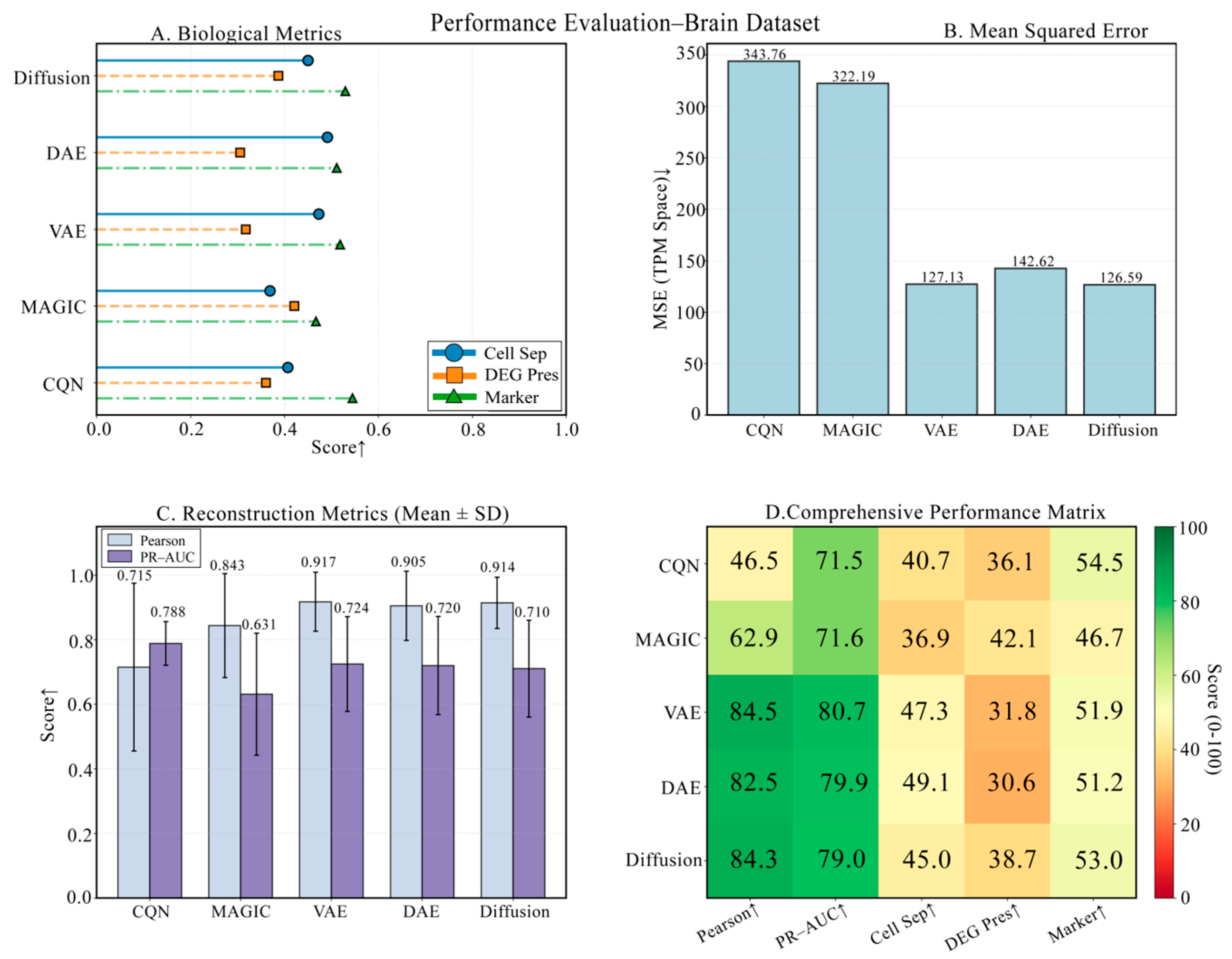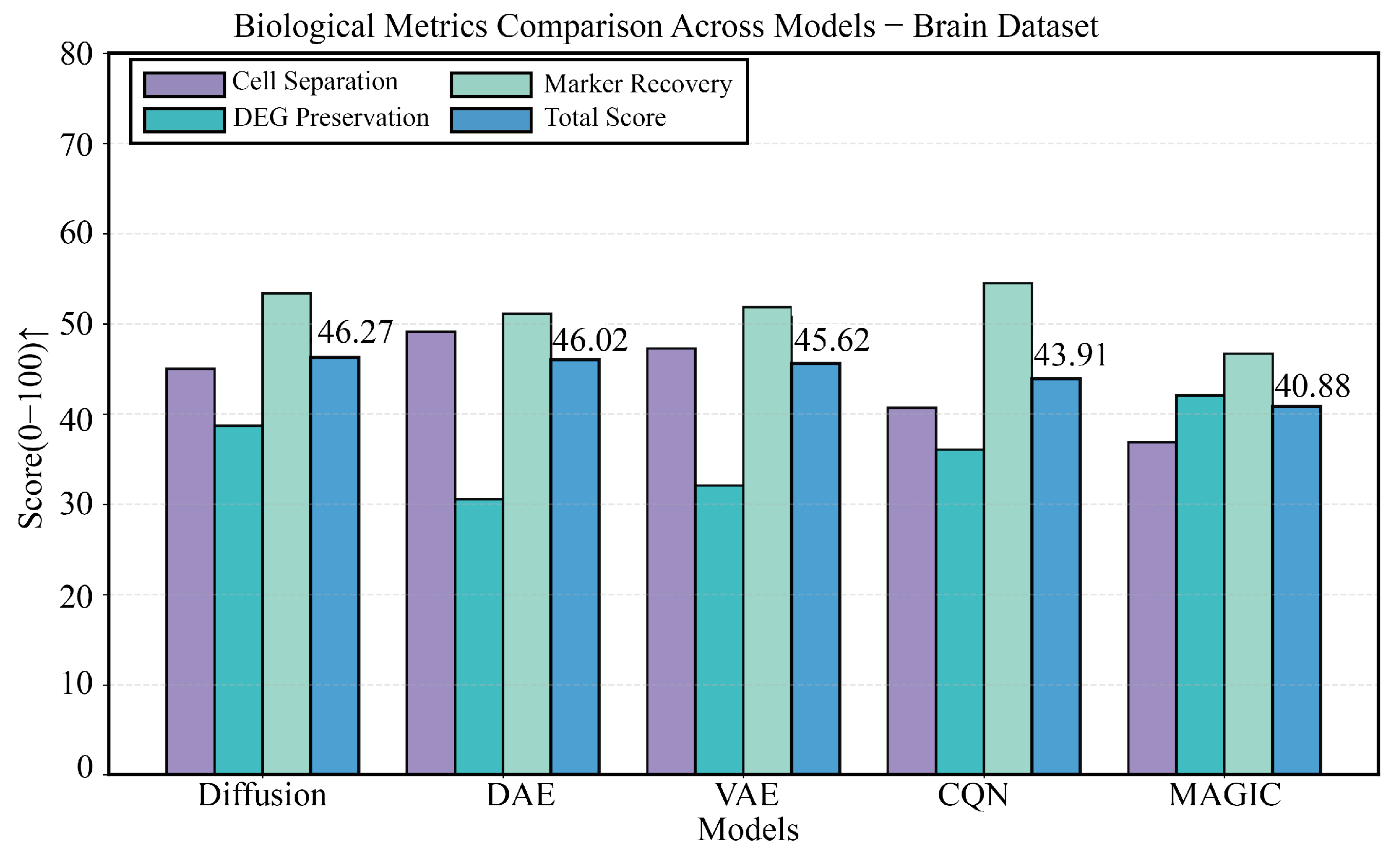 Figure 7. Detailed comparison of biological performance on the Brain dataset. This figure details the comparison of the five methods across four key biological metrics. The data once again confirm the inherent deficiency of DAE and VAE in DEG preservation. DiffRepairer, with its comprehensively superior performance across all biological metrics, achieved the highest overall score. The arrow (↑) indicates that higher scores represent better performance.
