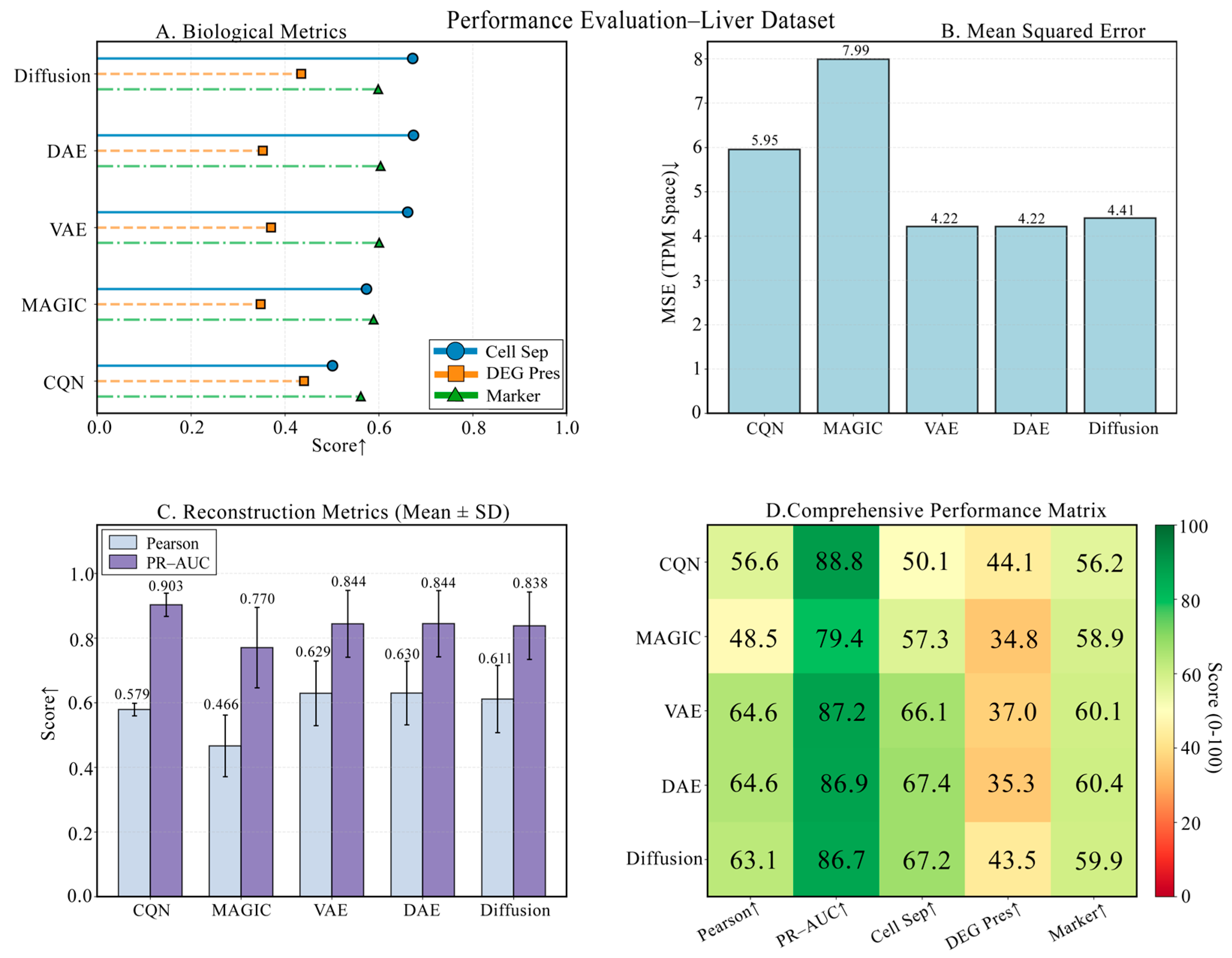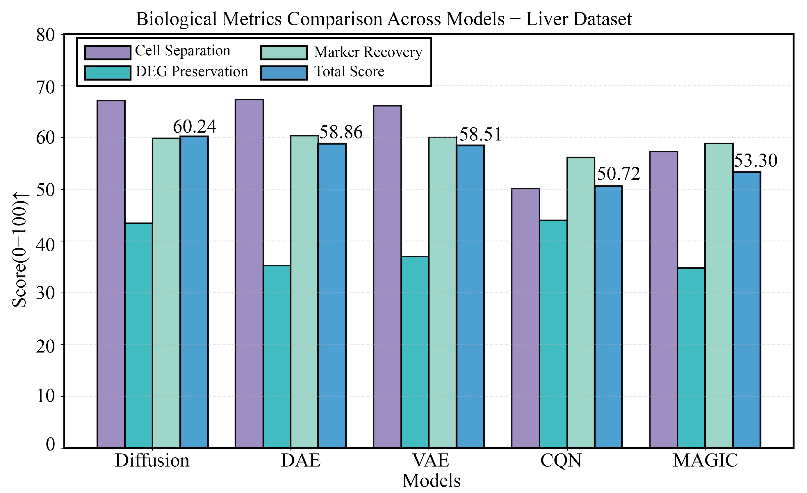 Figure 9. Detailed comparison of biological performance on the Liver dataset. This figure details the comparison of the five methods across four key biological metrics. Although CQN performed outstandingly in DEG preservation, DAE and VAE still scored low on this metric. DiffRepairer achieved the best balance across all metrics, obtaining the highest overall score. The arrow (↑) indicates that higher scores represent better performance.