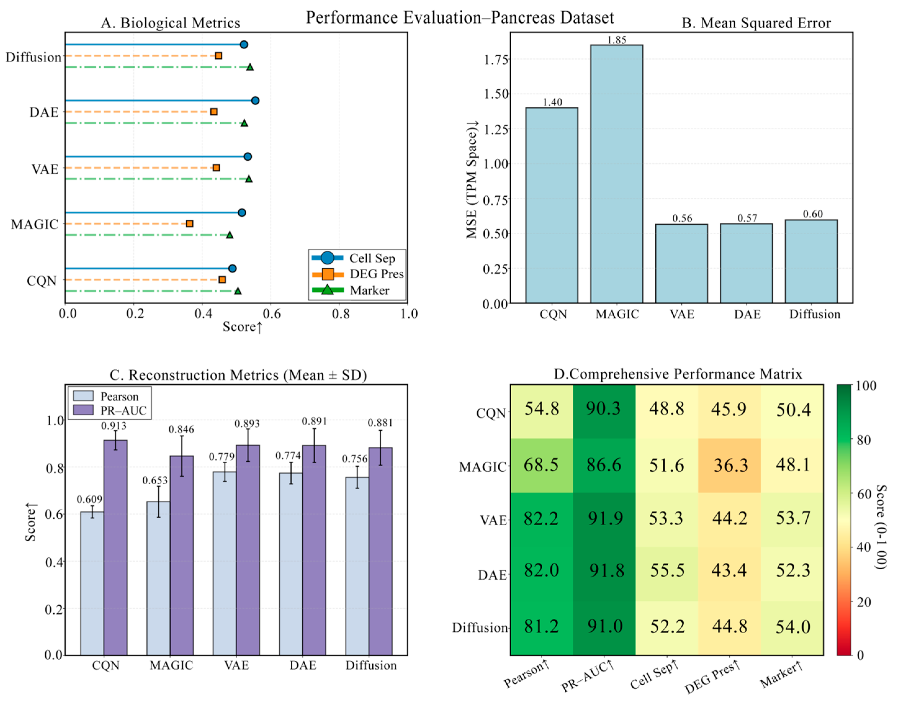 Figure 10. Performance challenge on the pancreas dataset with rare cells. (A) Biological metric scores. (B) Mean Squared Error (MSE). (C) Reconstruction metrics. (D) Comprehensive performance heatmap. This figure tests the models’ performance in handling high heterogeneity and rare cell detection challenges. Arrows indicate whether higher (↑) values represent better performance.