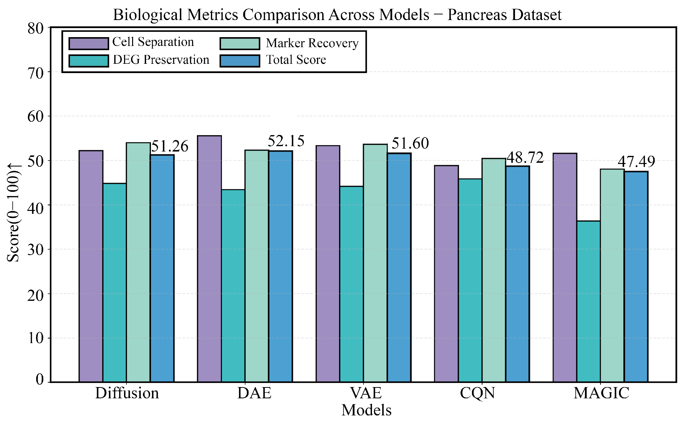 Figure 11. Detailed comparison of biological performance on the Pancreas dataset. This figure details the comparison of the five methods across four key biological metrics. The results again highlight the deficiency of DAE and VAE in DEG preservation. DiffRepairer, with its robustness, performed excellently across all metrics and achieved the highest overall score. The arrow (↑) indicates that higher scores represent better performance.