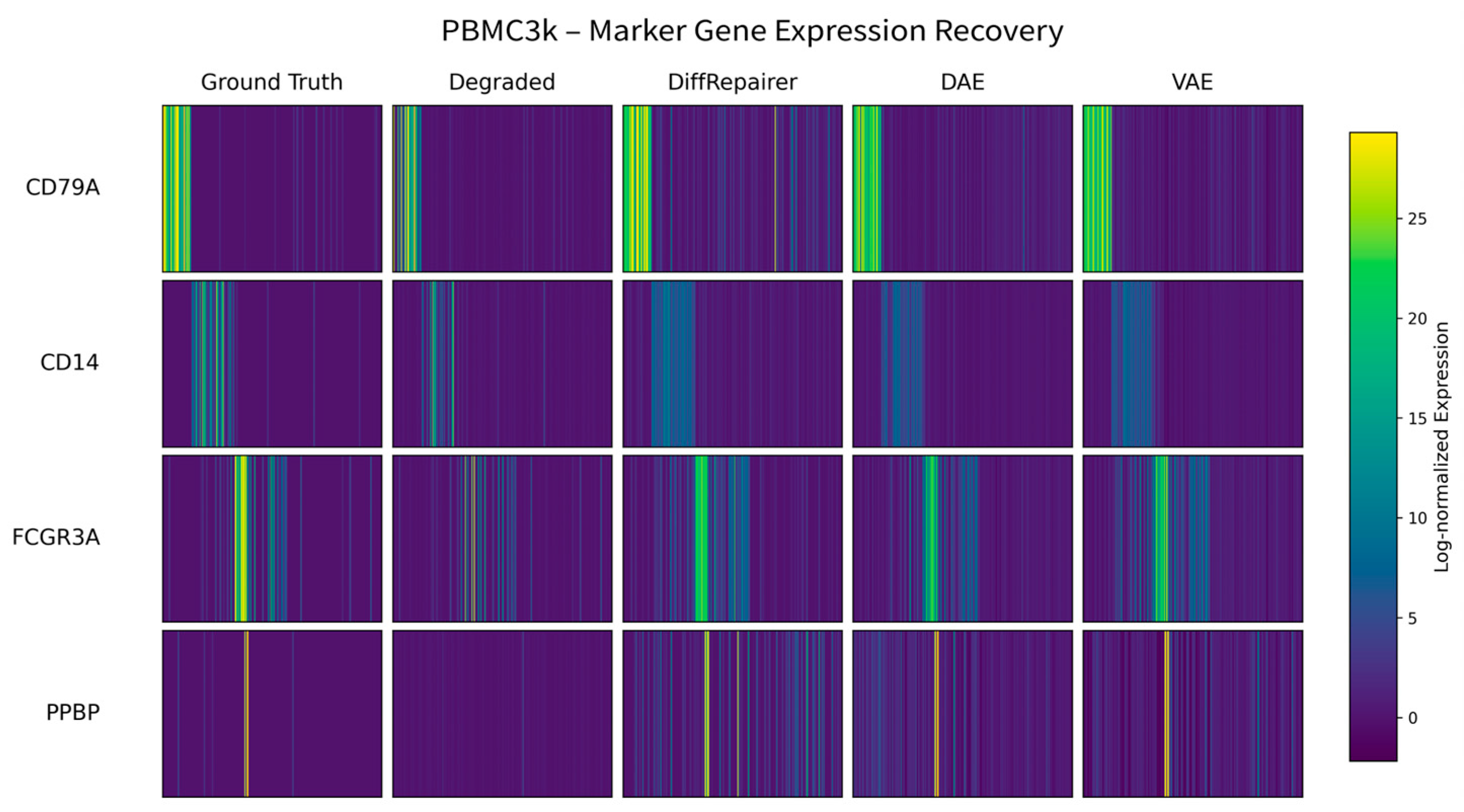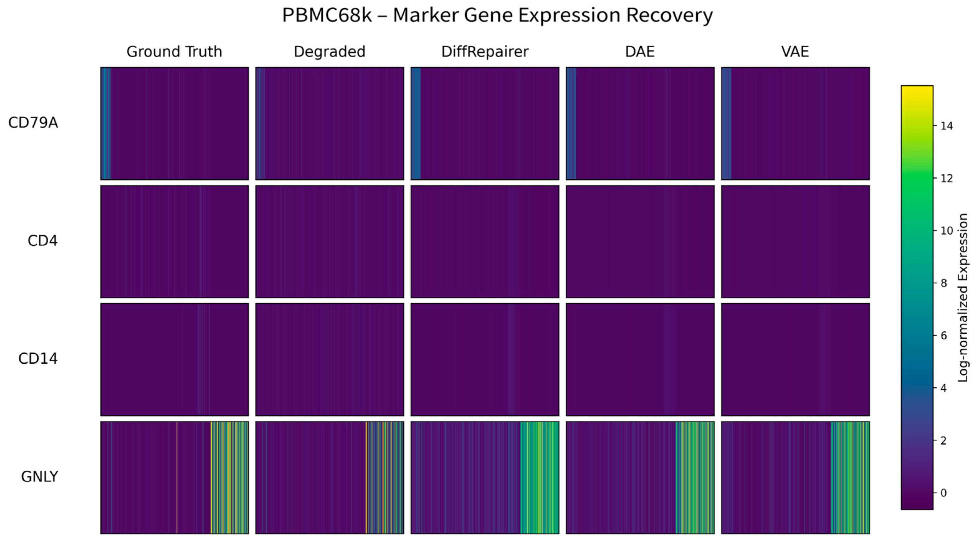 Figure 12. Heatmap of key marker genes in the PBMC3k dataset. The heatmap shows the effectiveness of different methods in restoring the expression profiles of key marker genes for B cells (MS4A1), CD4+ T cells (IL7R), CD8+ T cells (CD8A), and NK cells (GNLY). The expression patterns restored by DiffRepairer are closest to the original data.