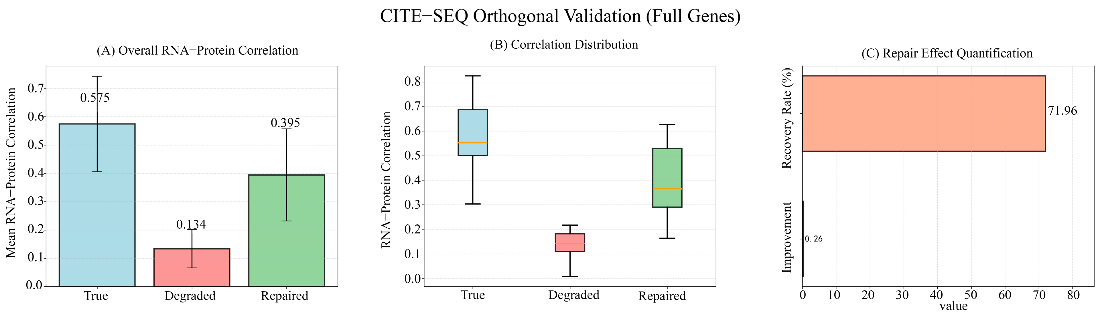Validation Results: The logic of this orthogonal validation is to first demonstrate that our simulation disrupts biological consistency, and then—critically—to show that our model can restore it. In the true data, the average RNA-protein correlation was 0.575 ± 0.168. After our degradation simulation was applied to the RNA data, this correlation dropped to 0.134 ± 0.068.