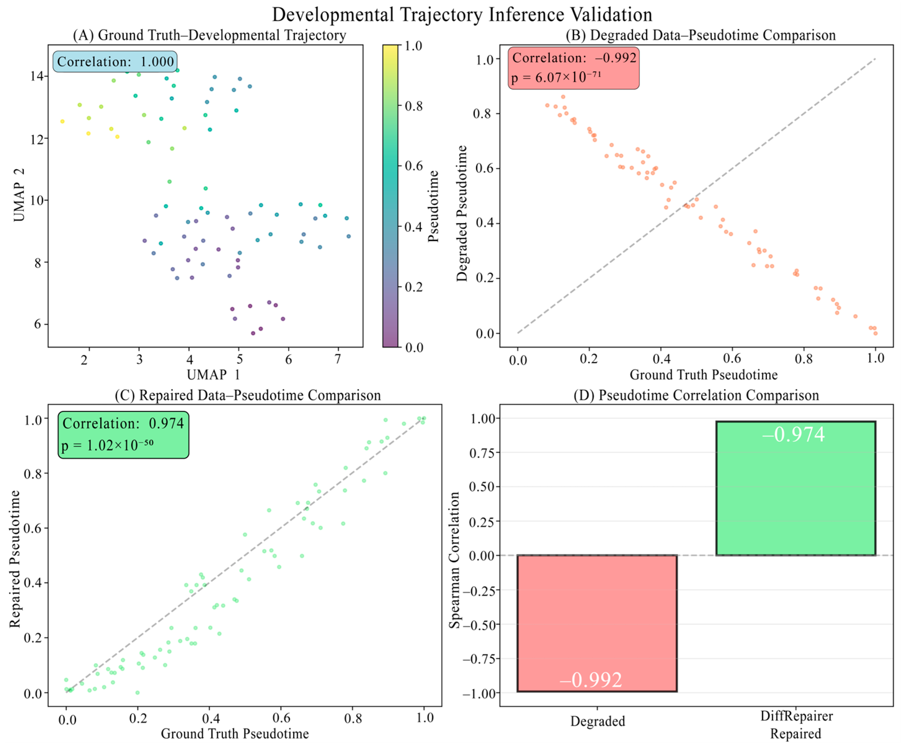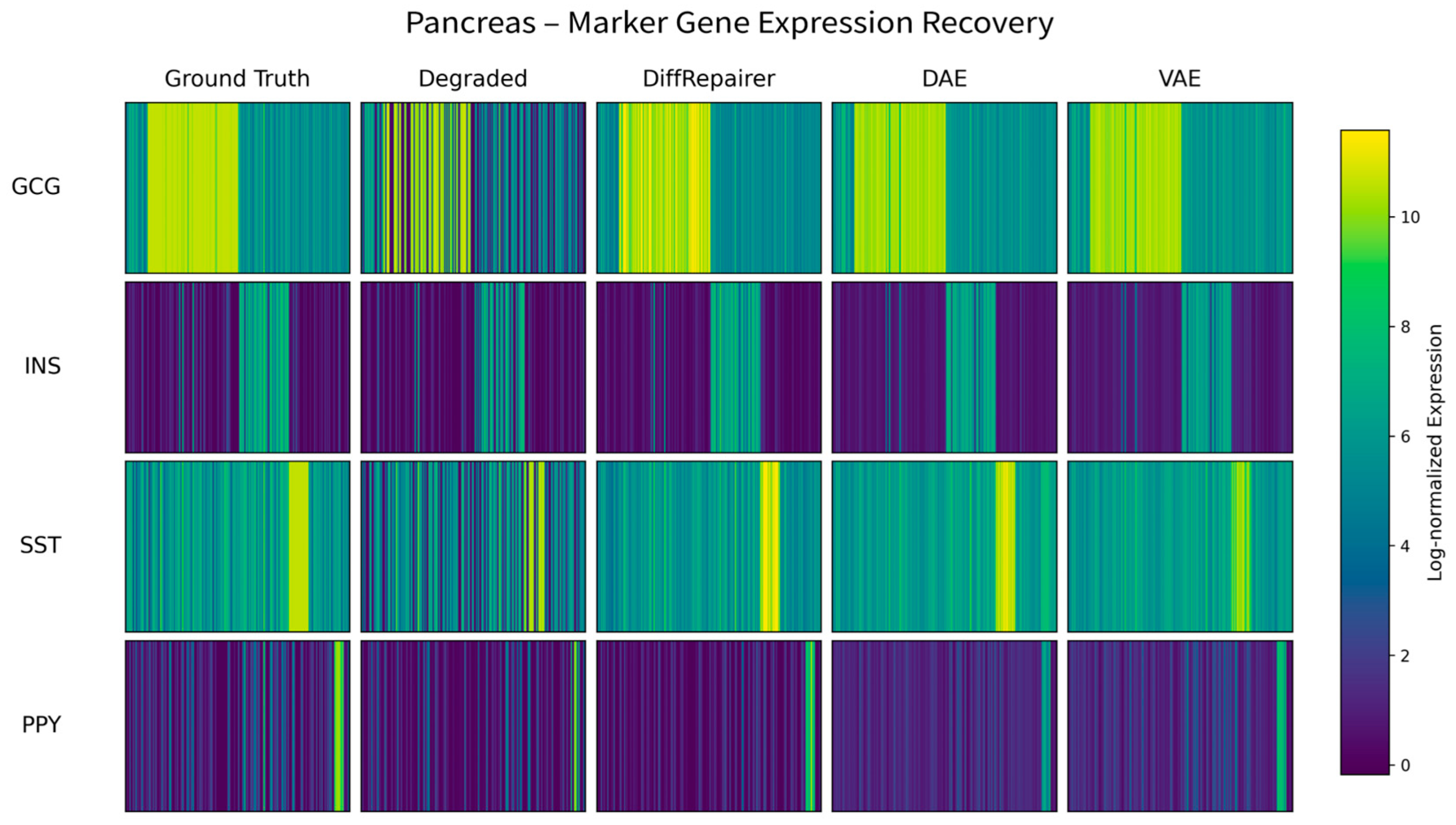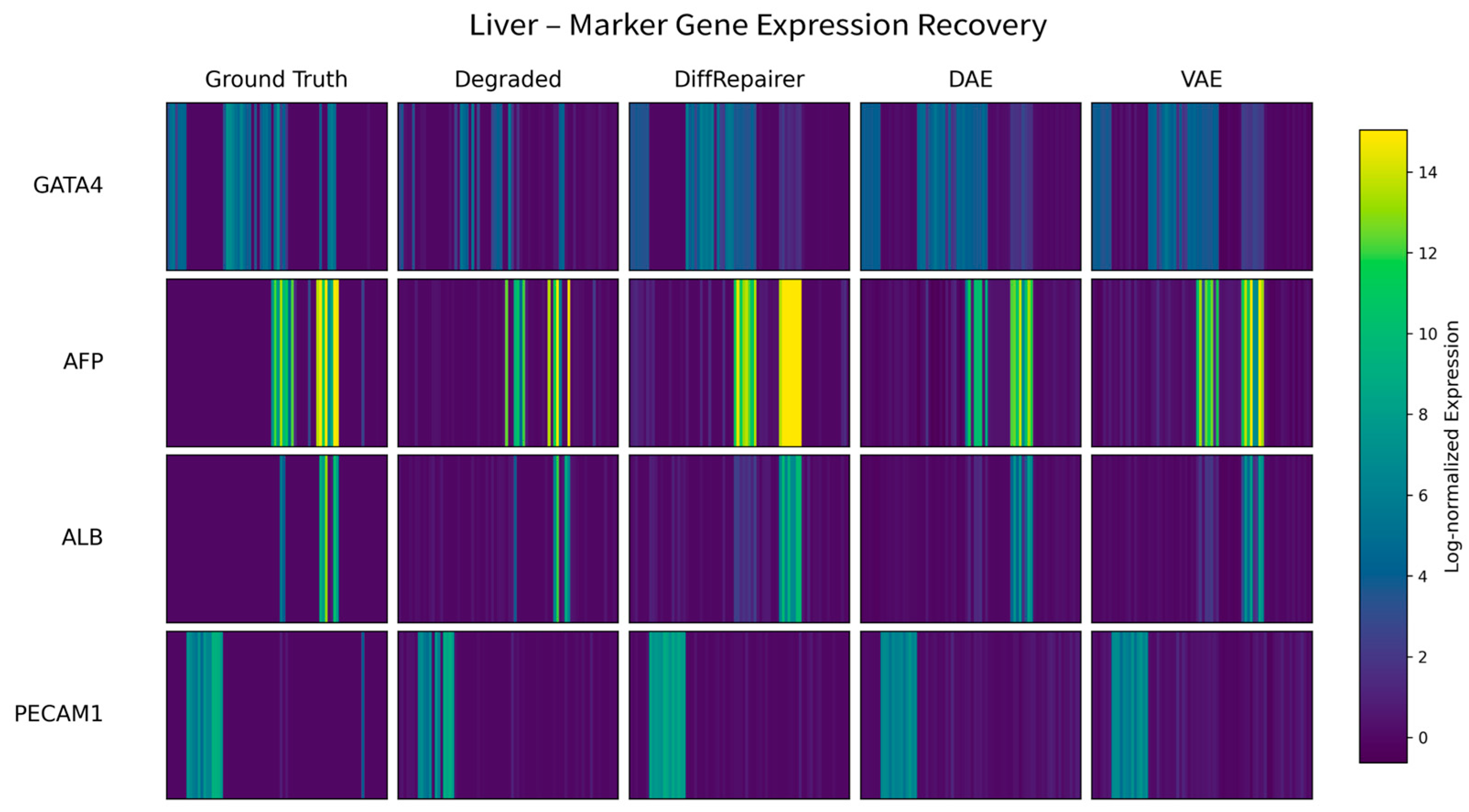 • Marker Gene Recovery: We calculate Spearman’s Correlation of known cell type marker genes before and after repair to measure the model’s ability to restore genes that define cell identity.