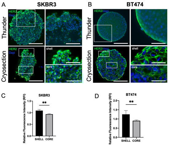 2.3. Immunofluorescence and Histological Analysis of Spheroids Formed by HER2+ BCa Cell Lines