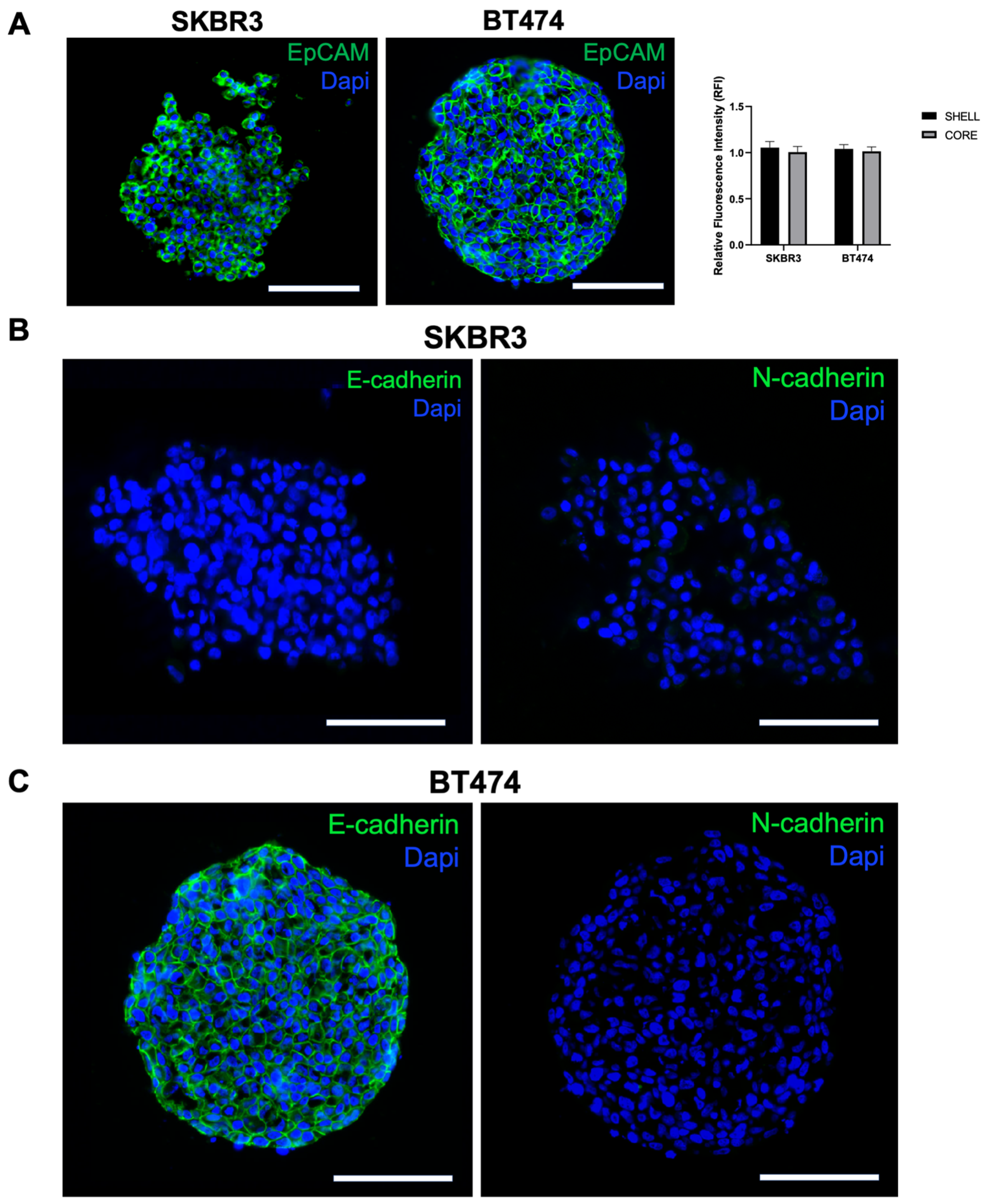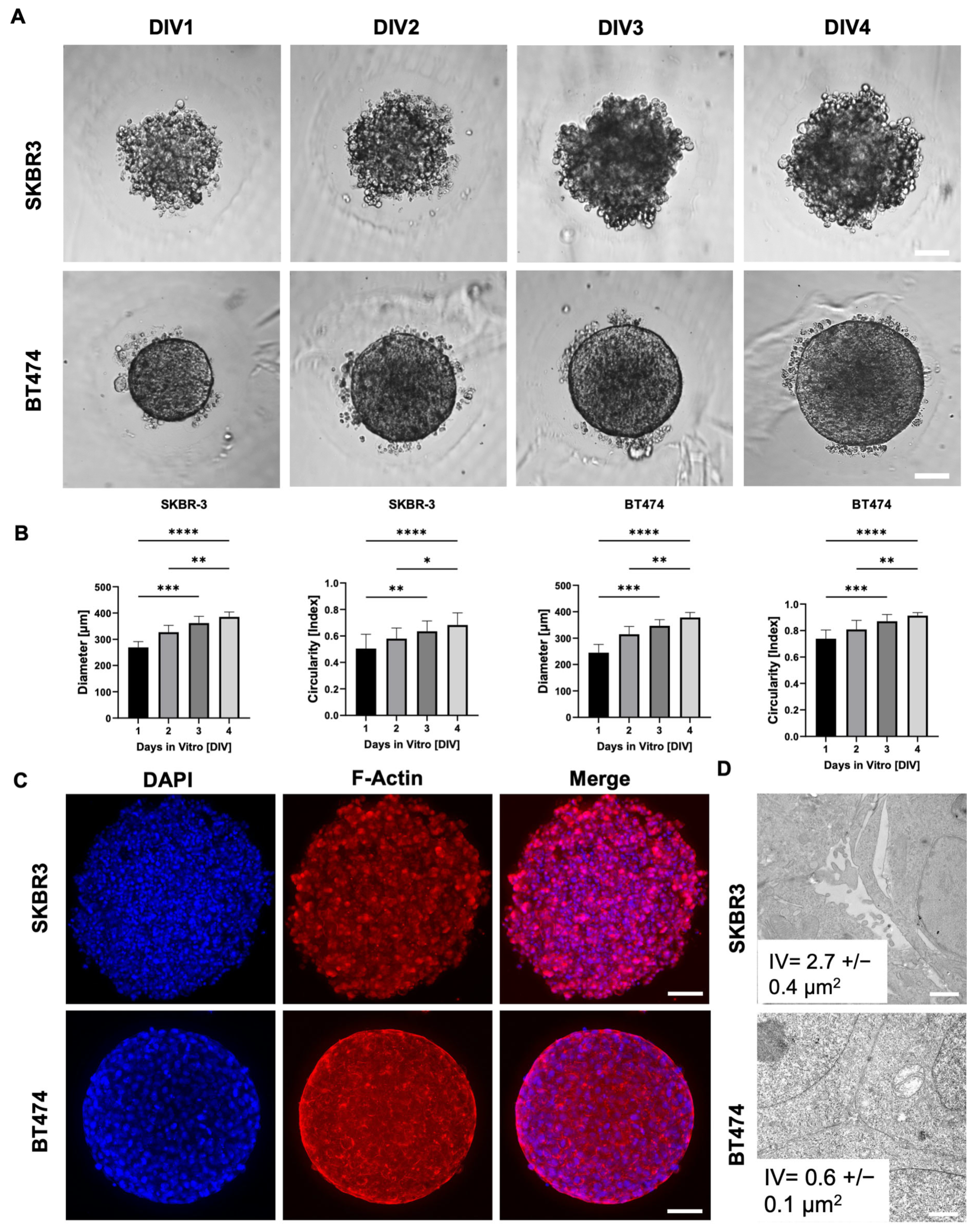 3.1. Distinct Morphologies and 3D Organization of HER2+ Breast Cancer Spheroids