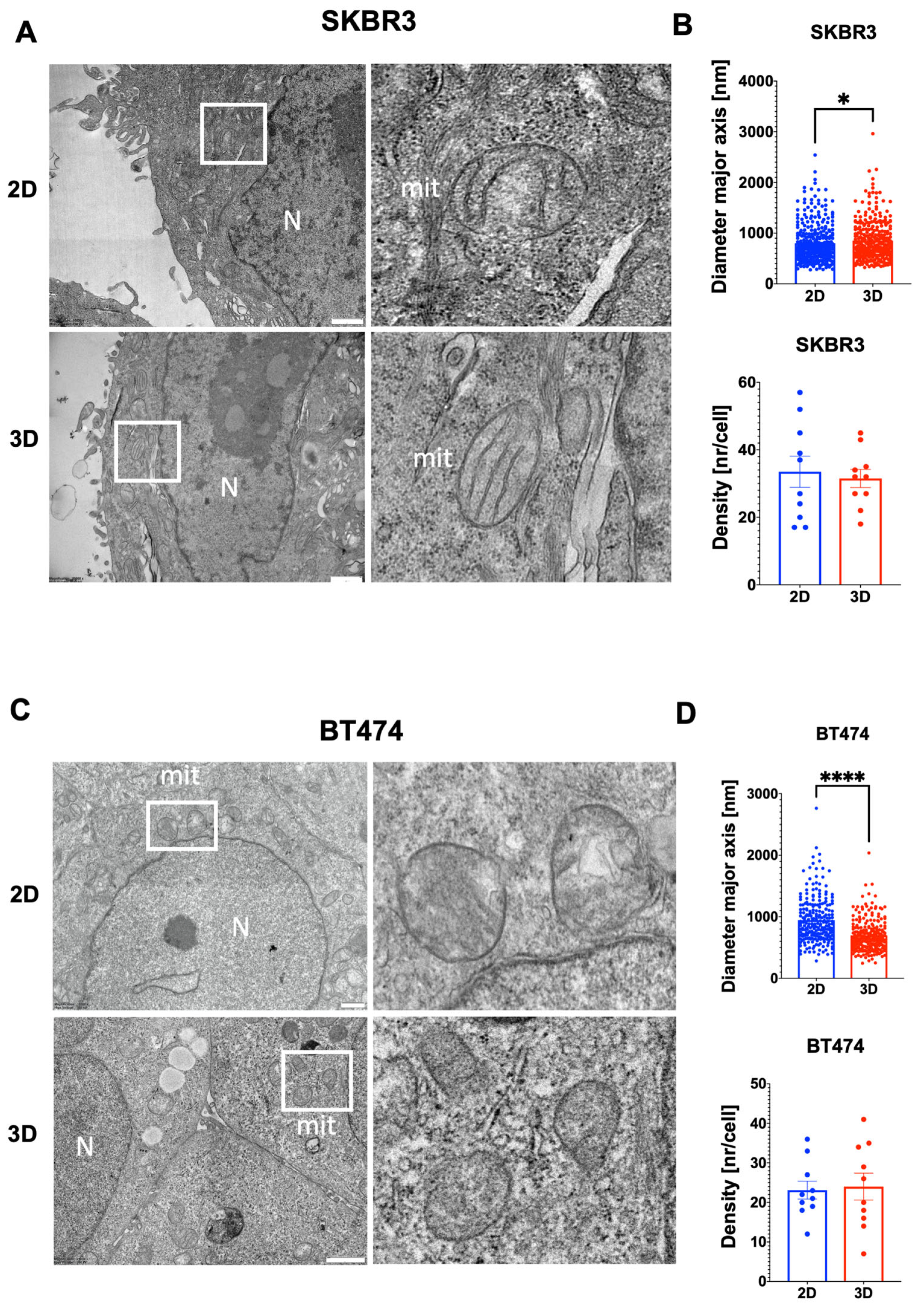 3.4. Ultrastructural Organization and Mitochondrial Remodeling in HER2+ BCa 2D/3D Models