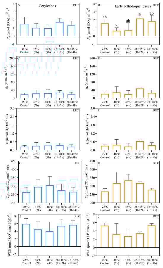 Gas exchange results of Coffea arabica cotyledonary leaves (blue bars) and orthotropic leaves (right side—orange bars), five days of recovery after heat stress (REC). Pn—net photosynthetic rate (A,B); gs—stomatal conductance (C,D); E—transpiration (E,F); Ci—intercellular carbon (G,H). WUE—water use efficiency (I,J). Different lowercase letters represent that the means are statistically different by one-way ANOVA and Tukey test (p < 0.05). Supplementary Table S2 shows a summary of one-way ANOVA results. n = 4; error bars = Standard deviation (SD).