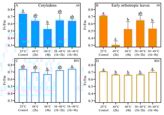 The maximum quantum yield (Fv/Fm) for Coffea arabica cotyledonary leaves (blue bars) and orthotropic leaves (orange bars). Filled bars represent after heat stress (AS) (A,B), and open bars represent five days after heat stress (REC) (C,D). Different lowercase letters represent different means by one-way ANOVA and Tukey test (p < 0.05); Supplementary Tables S1 and S2 show a summary of one-way ANOVA results. n = 8; error bars = Standard deviation (SD).