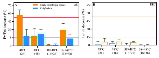 Percentage decrease in the maximum quantum yield (Fv/Fm) in early orthotropic (orange) and cotyledonary (blue) leaves of seedlings subjected to different heat stress regimes after stress (A) and after a recovery period (B). Bars represent mean ± standard deviation (SD). The grey line indicates a 15% decrease (T15 threshold), and the red line indicates a 50% decrease (T50 threshold).