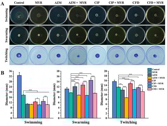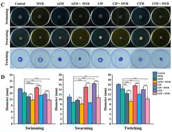 Effects of myricetin at 1/8 MIC concentration and antibiotics at 1/4 MIC concentration on the motility of P. aeruginosa ATCC 9027 and PA01. Swimming, swarming, and twitching motility of (A) ATCC 9027 group and (C) PA01 group. Statistics of swimming, swarming, and twitching motility diameters of (B) ATCC 9027 group and (D) PA01 group. Data are expressed as mean ± SD of at least three independent experiments (*, p < 0.05; **, p < 0.01; ***, p < 0.001).