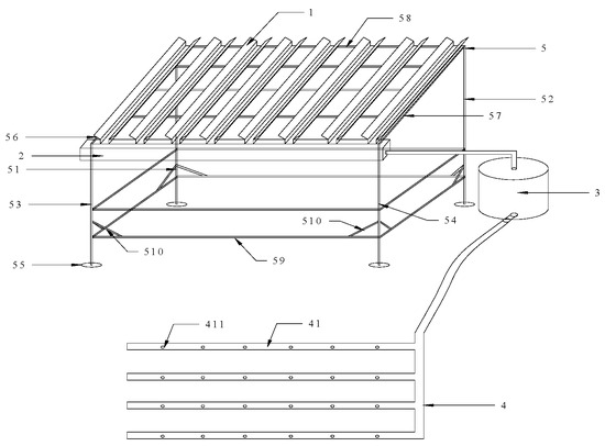 Precipitation Simulator. In the drawing: 1. Rainwater diversion groove, 2. Convergence groove, 3. Sleeping box, 4. Spraying device, 41. Spray pipe, 411. Spray hole, 5. Support frame, 51. First longitudinal rod, 52. Second longitudinal rod, 53. Third longitudinal rod, 54. Fourth longitudinal rod 55. Fixed chassis, 56. First steel pipe, 57. Second steel pipe, 58. Adapting pipe. 59. Cross bar, 510. Oblique strut.