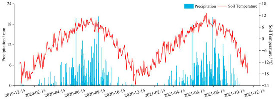 Figure 2 illustrates the seasonal progression of daily precipitation and 10 cm soil temperature from December 2019 to December 2021. Soil temperature followed a clear annual cycle, rising steadily from early spring, peaking between July and August, and declining sharply from late autumn into winter. Precipitation was concentrated in the growing season (May–September), forming distinct rainfall peaks during mid-summer, while winter precipitation remained extremely low. These joint temporal patterns reflect the typical alpine continental climate of the Qinghai–Tibet Plateau and provide essential environmental context for interpreting the greenhouse gas fluxes observed in 2020 and 2021.