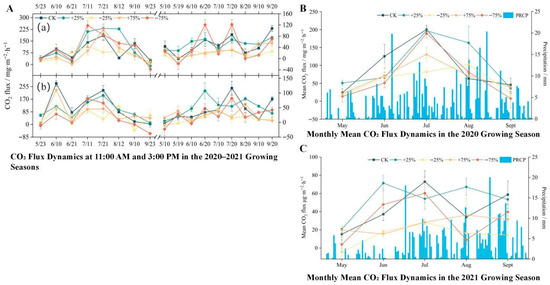 (A) Temporal and seasonal variation in ecosystem CO2 flux under different precipitation treatments during the 2020–2021 growing seasons. Diurnal CO2 flux dynamics at 11:00 a.m. (a) and 3:00 p.m. (b) from May to September in 2020 and 2021 under five precipitation treatments: control (CK), +25%, −25%, +75%, and −75%. Each point represents the mean flux of a specific sampling date, with error bars indicating the standard error of the mean (n = 3). (B) Monthly mean CO2 flux (line plots, left Y-axis) and daily precipitation (blue bars, right Y-axis) during the 2020 growing season. The flux values represent the average of all biweekly measurements within each month under each precipitation treatment. Error bars represent standard error (n = 6 per month). (C) Monthly mean CO2 flux and daily precipitation during the 2021 growing season, following the same structure as in panel B. The precipitation values in panels B and C are shared across all treatments as background climate conditions, while CO2 flux differs by treatment. All CO2 fluxes are expressed in mg·m−2·h−1. Precipitation is measured in mm. The growing season spans from late May to mid-September. Overall, ecosystem CO2 fluxes exhibited strong temporal variability, with higher fluxes observed during mid-growing season and under increased precipitation treatments.