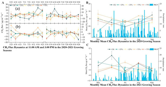 (A) Temporal and seasonal variation in ecosystem CH4 flux under different precipitation treatments during the 2020–2021 growing seasons. Diurnal CH4 flux dynamics at 11:00 a.m. (a) and 3:00 p.m. (b) from May to September in 2020 and 2021 under five precipitation treatments: control (CK), +25%, −25%, +75%, and −75%. Each point represents the mean flux of a specific sampling date, with error bars indicating the standard error of the mean (n = 3). (B) Monthly mean CH4 flux (line plots, left Y-axis) and daily precipitation (blue bars, right Y-axis) during the 2020 growing season. The flux values represent the average of all biweekly measurements within each month under each precipitation treatment. Error bars represent standard error (n = 6 per month). (C) Monthly mean CH4 flux and daily precipitation during the 2021 growing season, following the same structure as in panel B. The precipitation values in panels B and C are shared across all treatments as background climate conditions, while CH4 flux differs by treatment. All CH4 fluxes are expressed in mg·m−2·h−1. Precipitation is measured in mm. The growing season spans from late May to mid-September. Overall, ecosystem CH4 fluxes exhibited strong temporal variability, with higher fluxes observed during mid-growing season and under increased precipitation treatments.