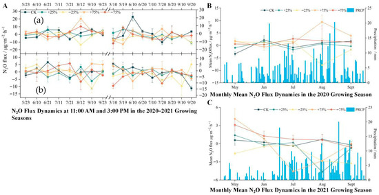 (A) Temporal and seasonal variation in ecosystem N2O flux under different precipitation treatments during the 2020–2021 growing seasons. Diurnal N2O flux dynamics at 11:00 a.m. (a) and 3:00 p.m. (b) from May to September in 2020 and 2021 under five precipitation treatments: control (CK), +25%, −25%, +75%, and −75%. Each point represents the mean flux of a specific sampling date, with error bars indicating the standard error of the mean (n = 3). (B) Monthly mean N2O flux (line plots, left Y-axis) and daily precipitation (blue bars, right Y-axis) during the 2020 growing season. The flux values represent the average of all biweekly measurements within each month under each precipitation treatment. Error bars represent standard error (n = 6 per month). (C) Monthly mean N2O flux and daily precipitation during the 2021 growing season, following the same structure as in panel B. The precipitation values in panels B and C are shared across all treatments as background climate conditions, while N2O flux differs by treatment. All N2O fluxes are expressed in mg·m−2·h−1. Precipitation is measured in mm. The growing season spans from late May to mid-September. Overall, ecosystem N2O fluxes exhibited strong temporal variability, with higher fluxes observed during mid-growing season and under increased precipitation treatments.