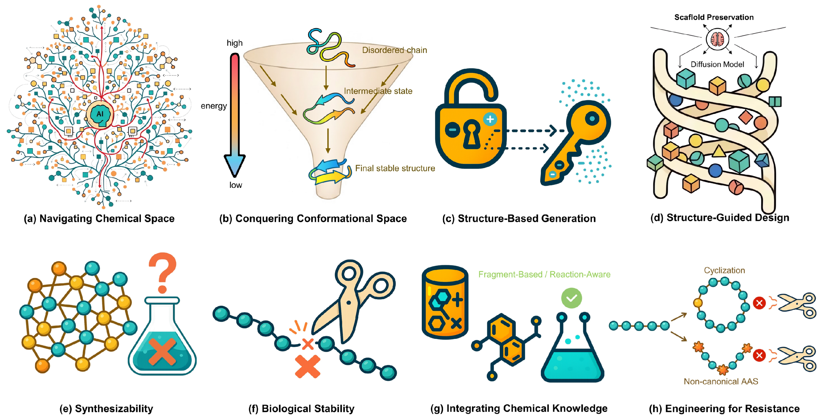 | Key Challenge | Synthesizability: Can it be made? [132] Stereochemistry control | Biological Stability: Folding, proteolysis Immunogenicity avoidance [190] |