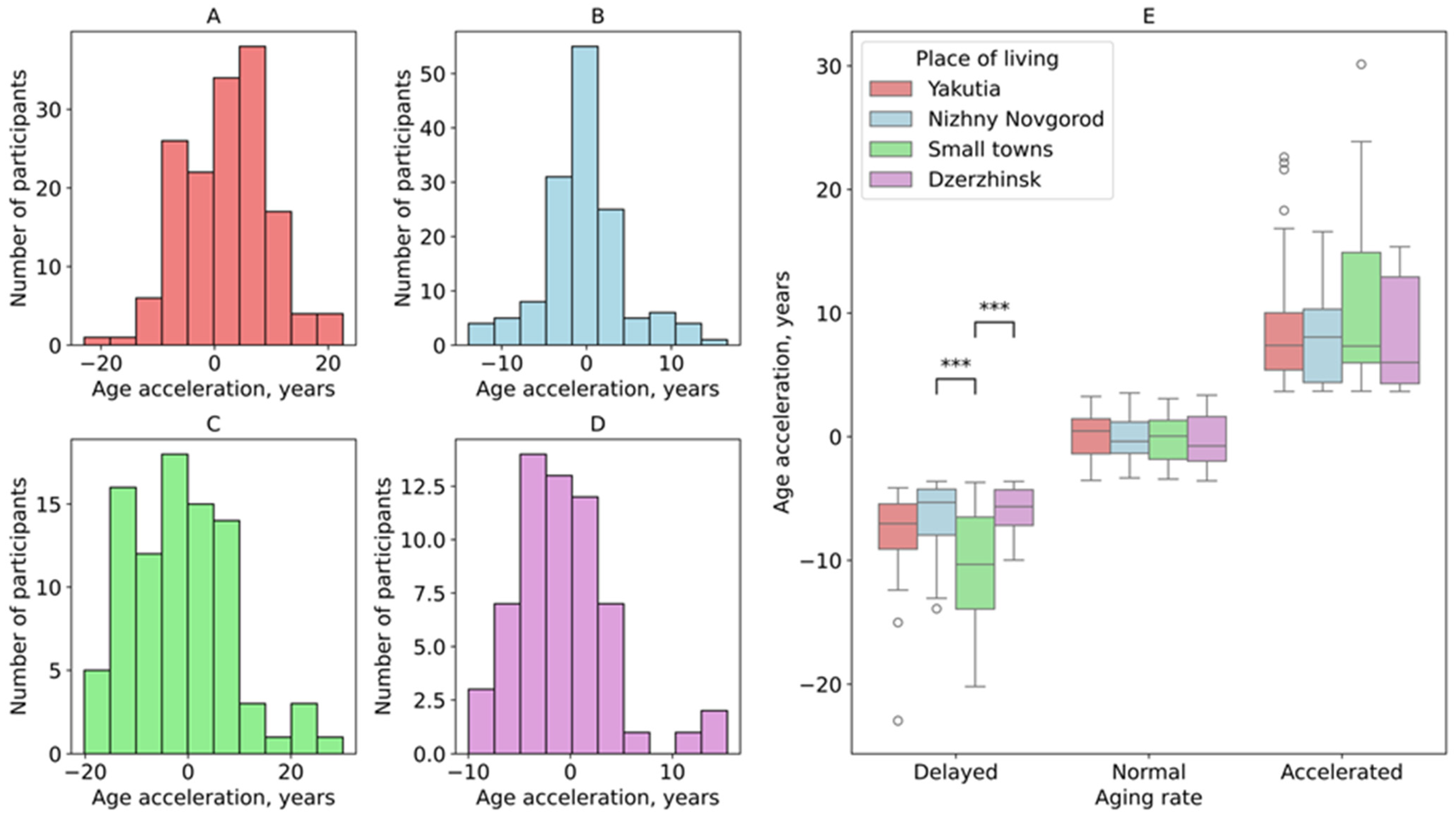3.1. Age Acceleration Rate Across the Studied Groups