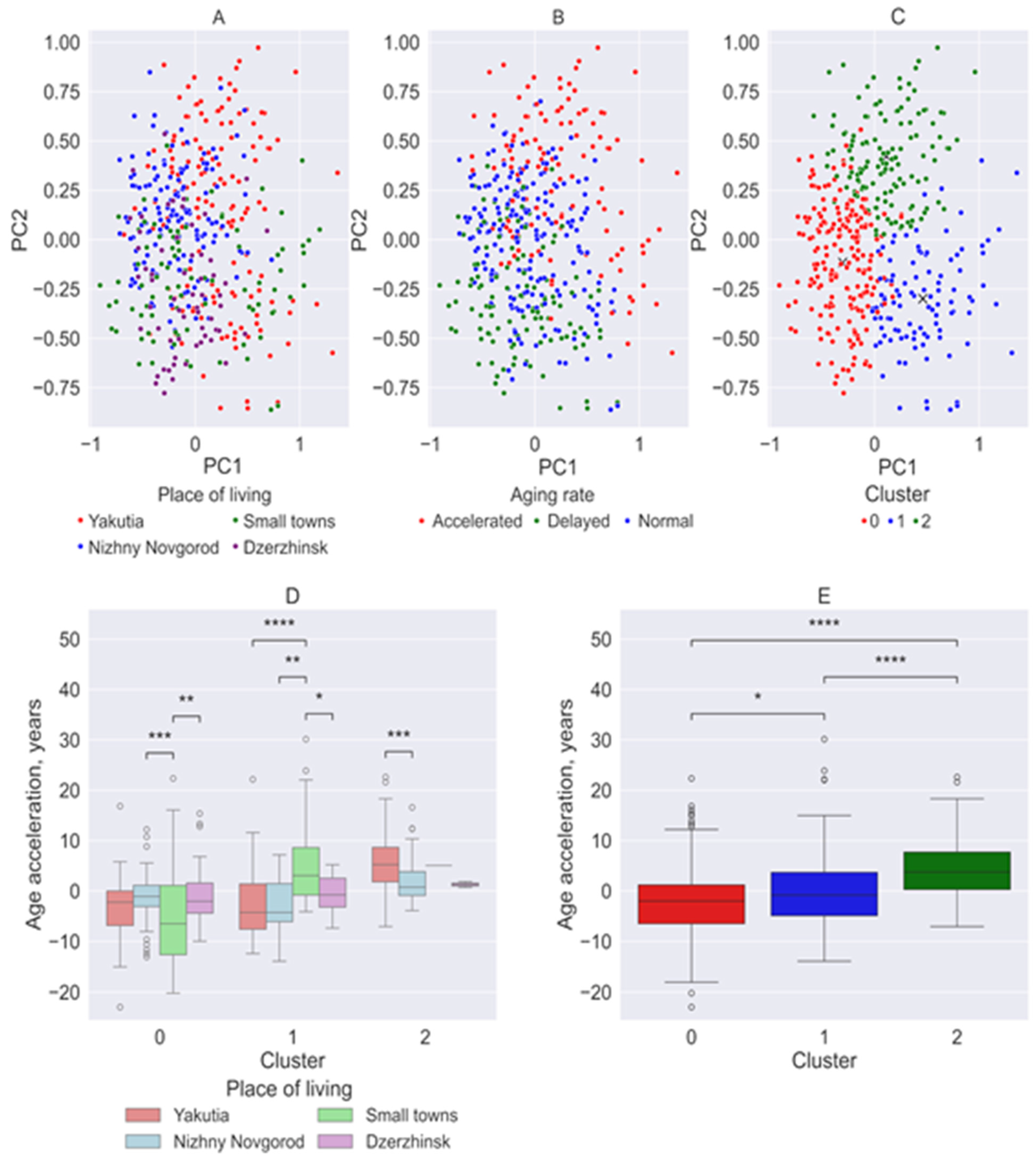 - Yusipov, I.; Kondakova, E.; Kalyakulina, A.; Krivonosov, M.; Lobanova, N.; Bacalini, M.G.; Franceschi, C.; Vedunova, M.; Ivanchenko, M. Accelerated epigenetic aging and inflammatory/immunological profile (ipAGE) in patients with chronic kidney disease. Geroscience 2022, 44, 817–834. [Google Scholar] [CrossRef]