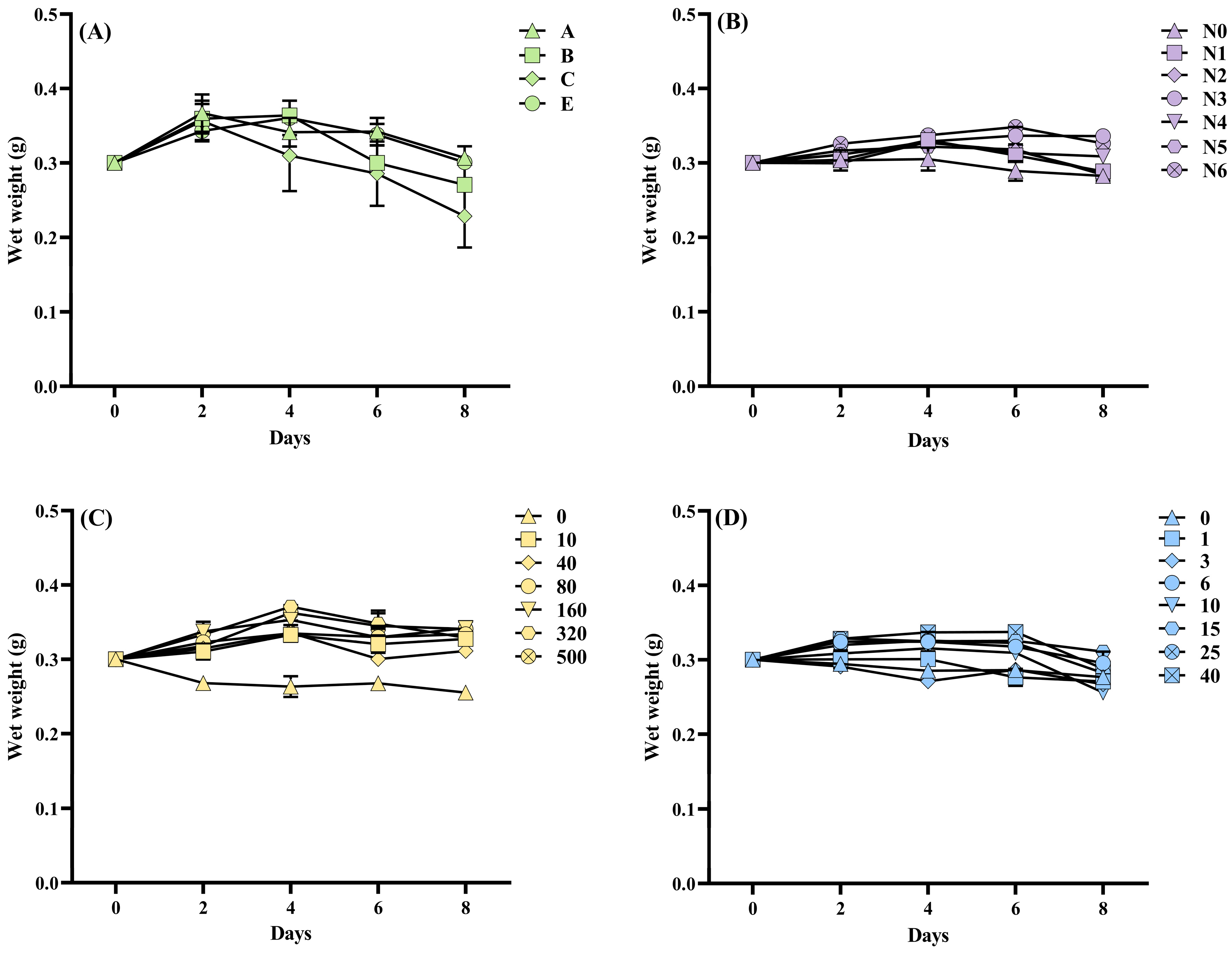 - Six nitrogen sources (160 µmol L−1 total N): NO3−-N (N1), NH4+-N (N2), Urea-N (N3), NO3−-N:NH4+-N = 1:1 (N4), NO3−-N:Urea-N = 1:1 (N5), NH4+-N:Urea-N = 1:1 (N6), and a N-free control (N0);