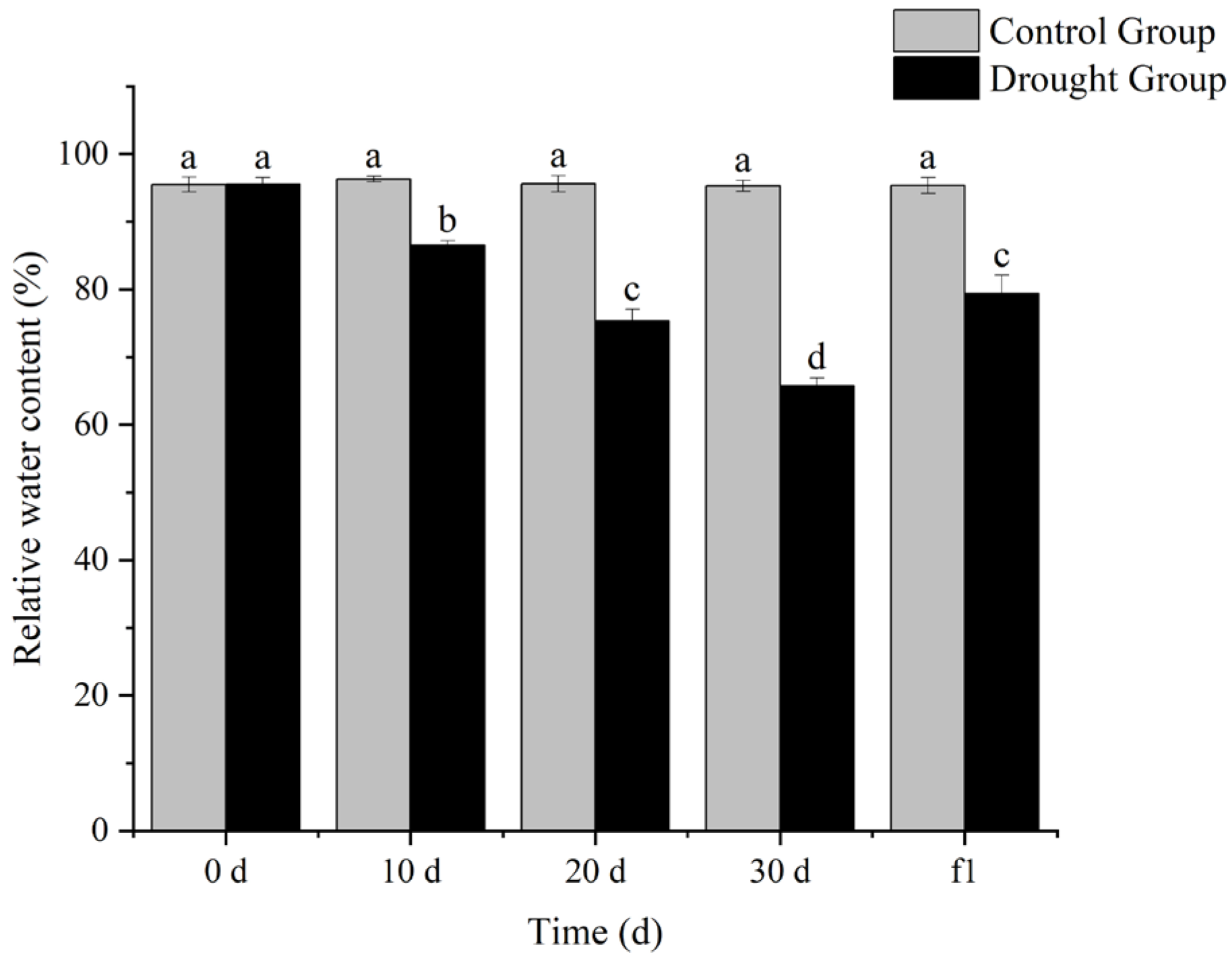 The relative water content (RWC) of plant leaves reflects the water status and water retention capacity of plants, and serves as a crucial indicator for evaluating the strength of plants’ drought resistance. As shown in