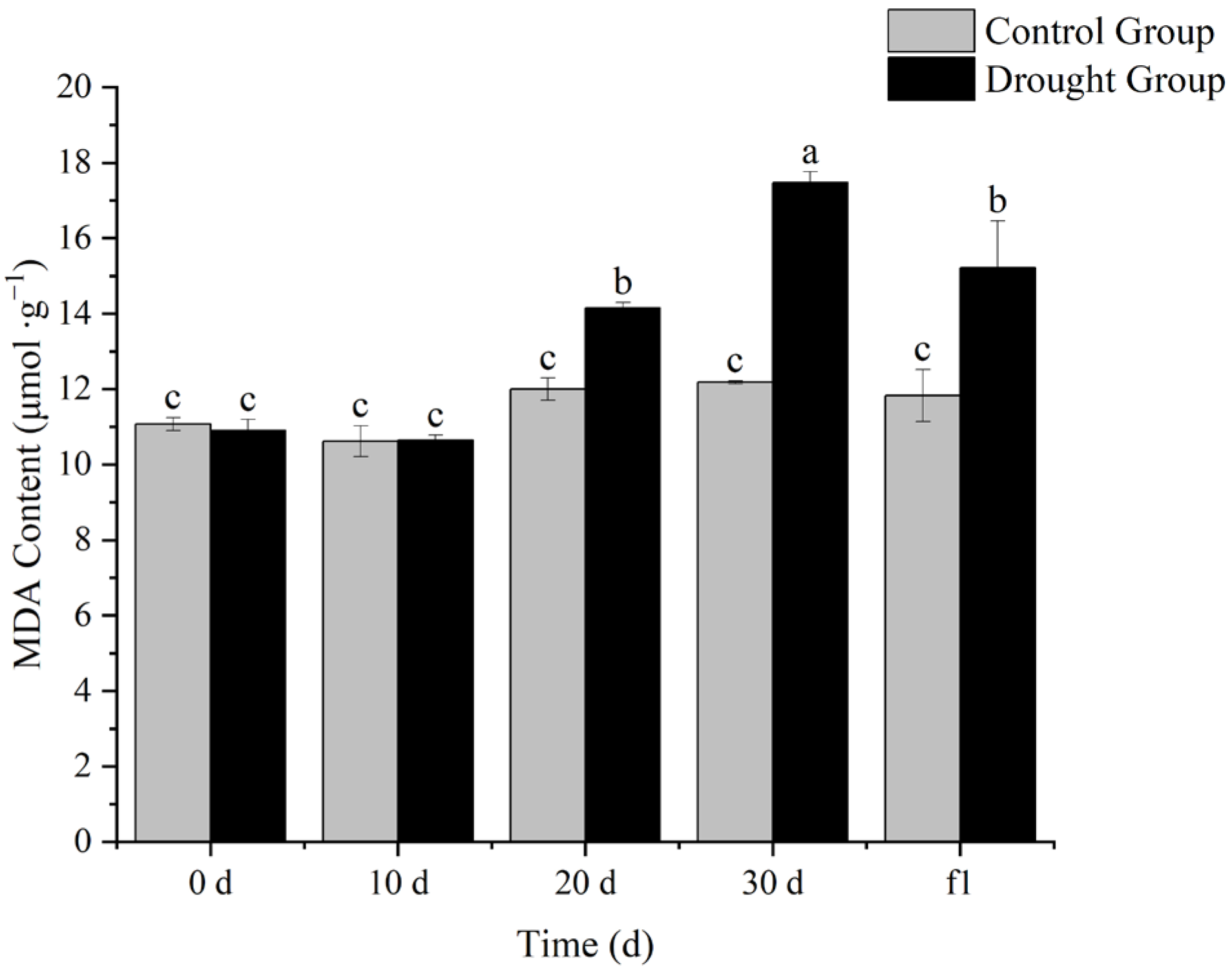 Figure 3, there was no significant difference between the treatment group and the control group on day 0 of treatment. On day 20 of drought stress, a significant difference was observed between the treatment group and the control group of the same period. The significant difference further increased on day 30 of drought stress, and was alleviated after rewatering. The differences in MDA content indicate that drought stress induces membrane lipid peroxidation in