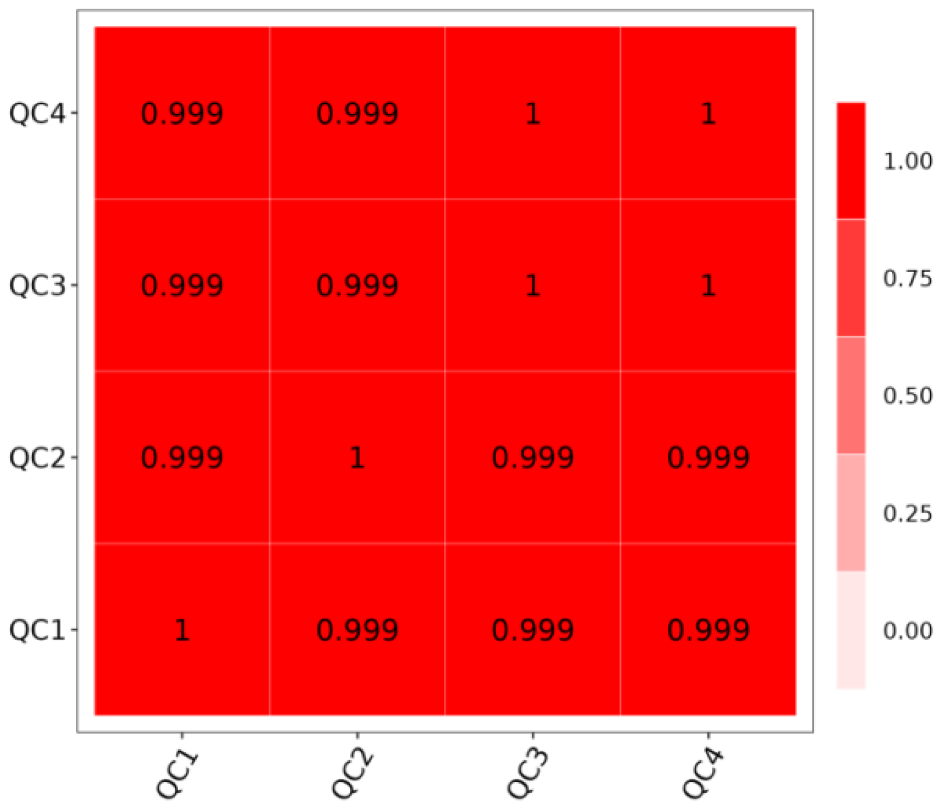 Figure 5, the sample correlation coefficients are all near 1, signifying strong linear relationships and high repeatability among the samples. This high repeatability is indicative of the samples’ suitability for further analysis.
