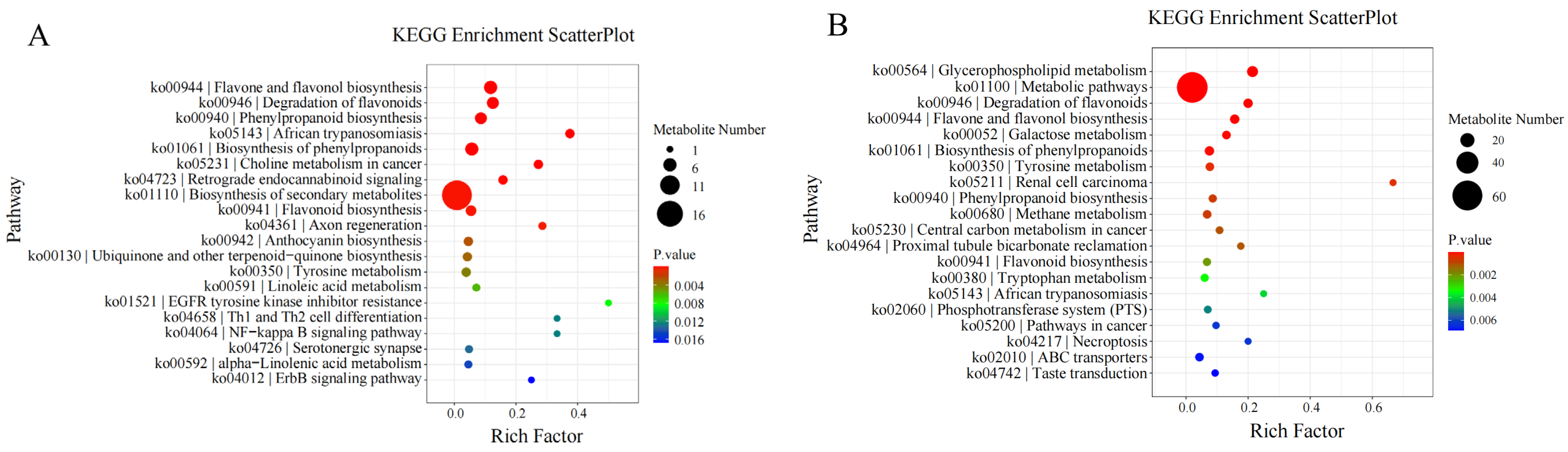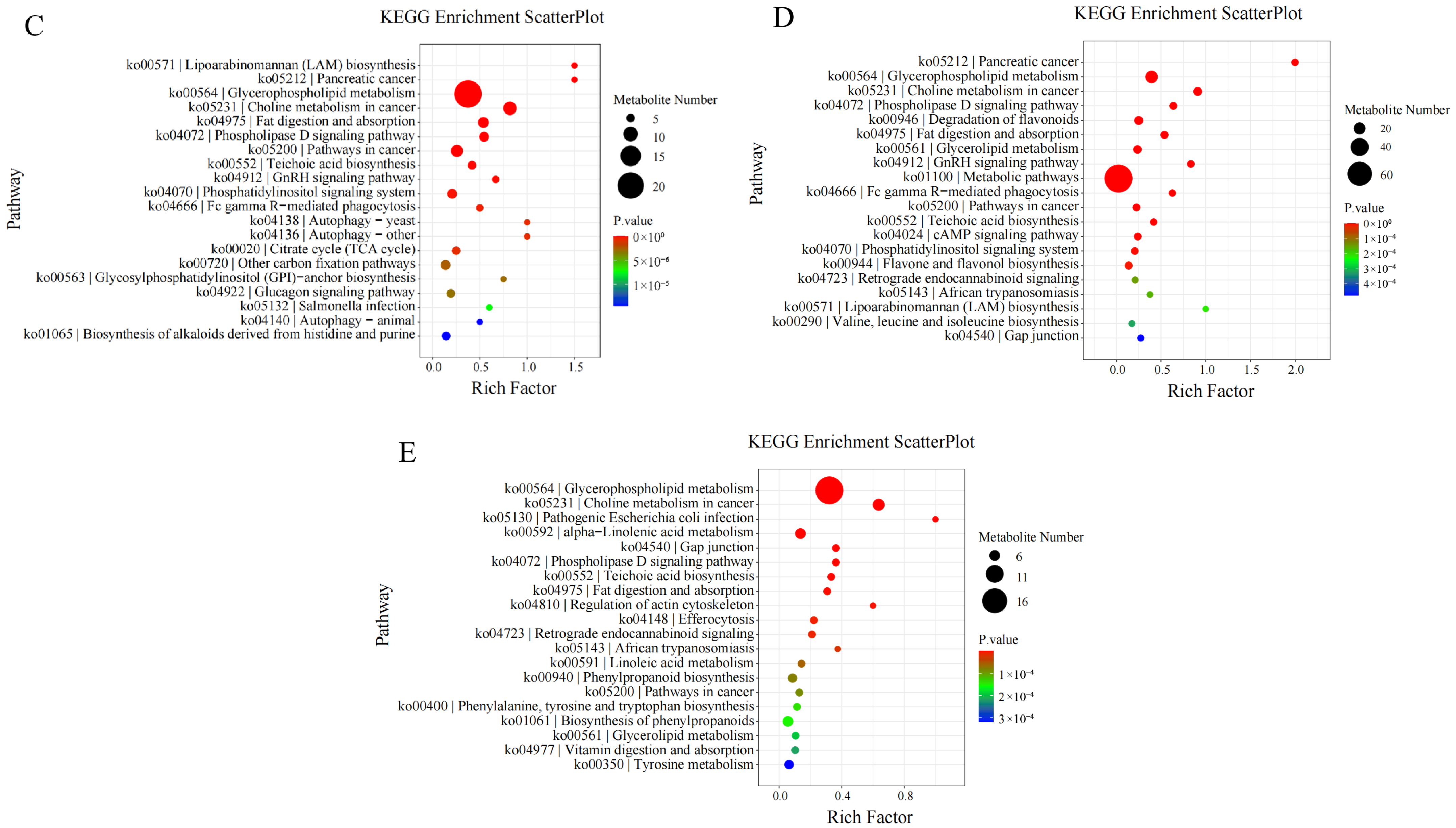 3.8. KEGG Enrichment Analysis of Differential Metabolites