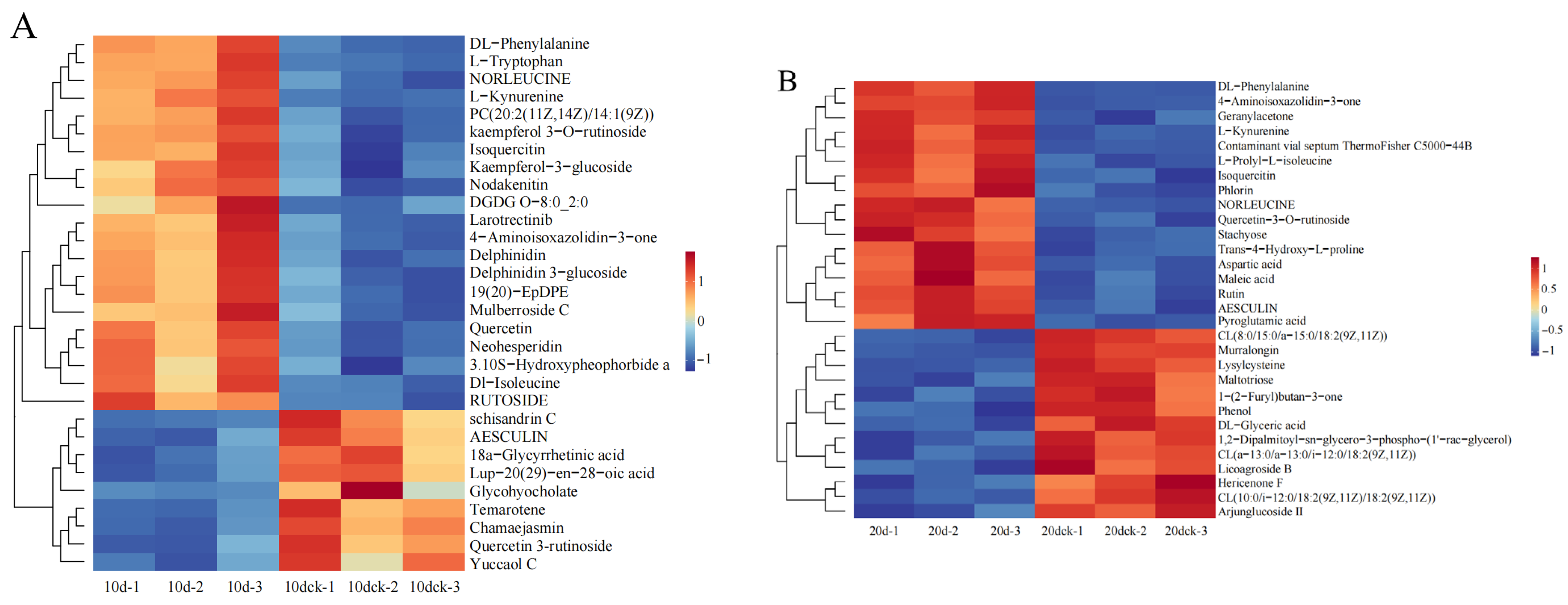 In addition, by comparing the differentially expressed metabolites related to metabolic pathways between the two stages (20 d vs. 20 dck and f1 vs. f1 ck), it was found that on the 20th day of drought stress, the contents of DL-phenylalanine and pyroglutamic acid were higher than those in the control group, while the contents of cardiolipin and DL-glyceric acid were lower than those in the control group.