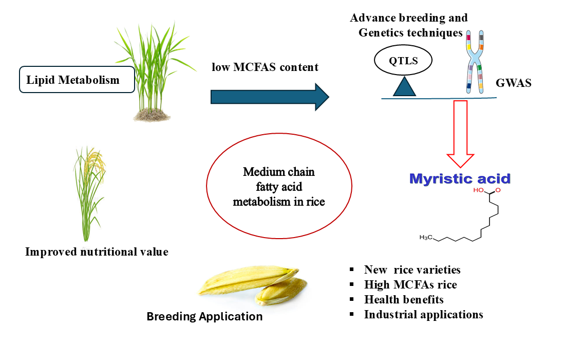 Medium-chain fatty acids (MCFAs), with carbon chain length of 6 to 12 carbon atoms, have received substantial attention in metabolism and applications in health, agriculture and industry. They have shown promising therapeutic effects for metabolic disorders such as obesity, diabetes, and neuro-triglycerides (MTGs) enriched in fatty acids. Rice (Oryza sativa L.) is one of the most widely used starchy crops around the world. New varieties have a lower level of starch and include lipid profiles that could make rice oil possess better nutritional quality and generate novel possibilities in biofuel production. With the help of new genetic and breeding techniques, the expression of genes that involve fatty acid biosynthesis can be altered. CRISPR/Cas9 and marker-assisted selection (MAS) are currently enhancing the fatty acid content in rice varieties without affecting the yield and various agronomic traits. This review presents the progress on the knowledge of rice MCFA biosynthetic pathways, genetic determinants of MCFA biosynthesis, and breeding technologies for enhancing MCFA production in rice. It also addresses wider implications of this research, including possible enhancement in human nutritional quality and development of sustainable agriculture.