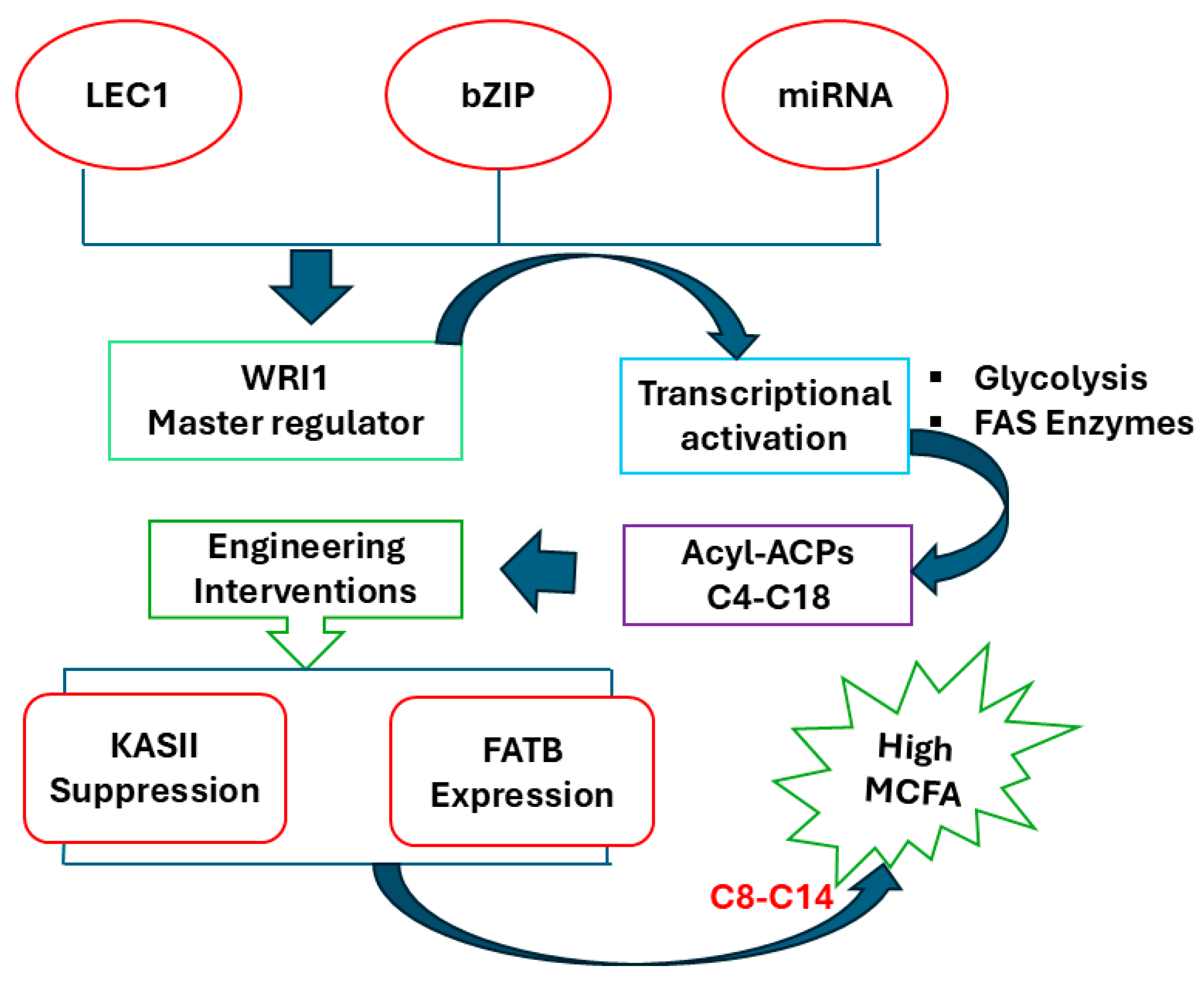Figure 4. Metabolic pathway design for high-yield MCFA biosynthesis. Increased transcriptional activation (LEC1, bZIP, and WRI1) increases flux into FA synthesis. Selective inhibition of KASII and expression of FATB leads to carbon flux towards medium-chain fatty acids (C8–C14) instead of long-chain (C16–C18).