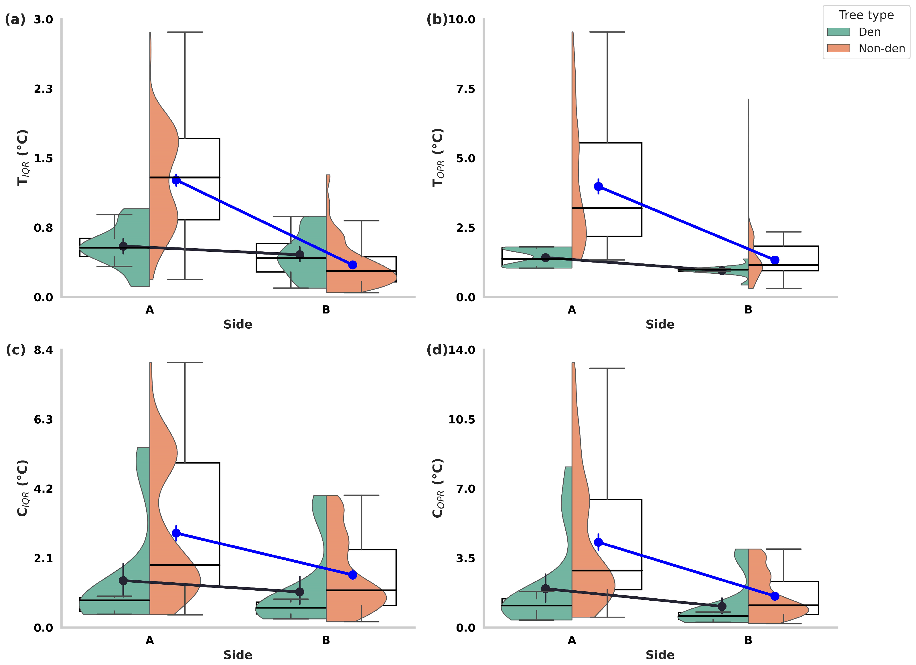 When considered separately for den and non-den trees, the pattern becomes even more revealing. Den trees consistently exhibited smaller side-to-side differences (ΔT