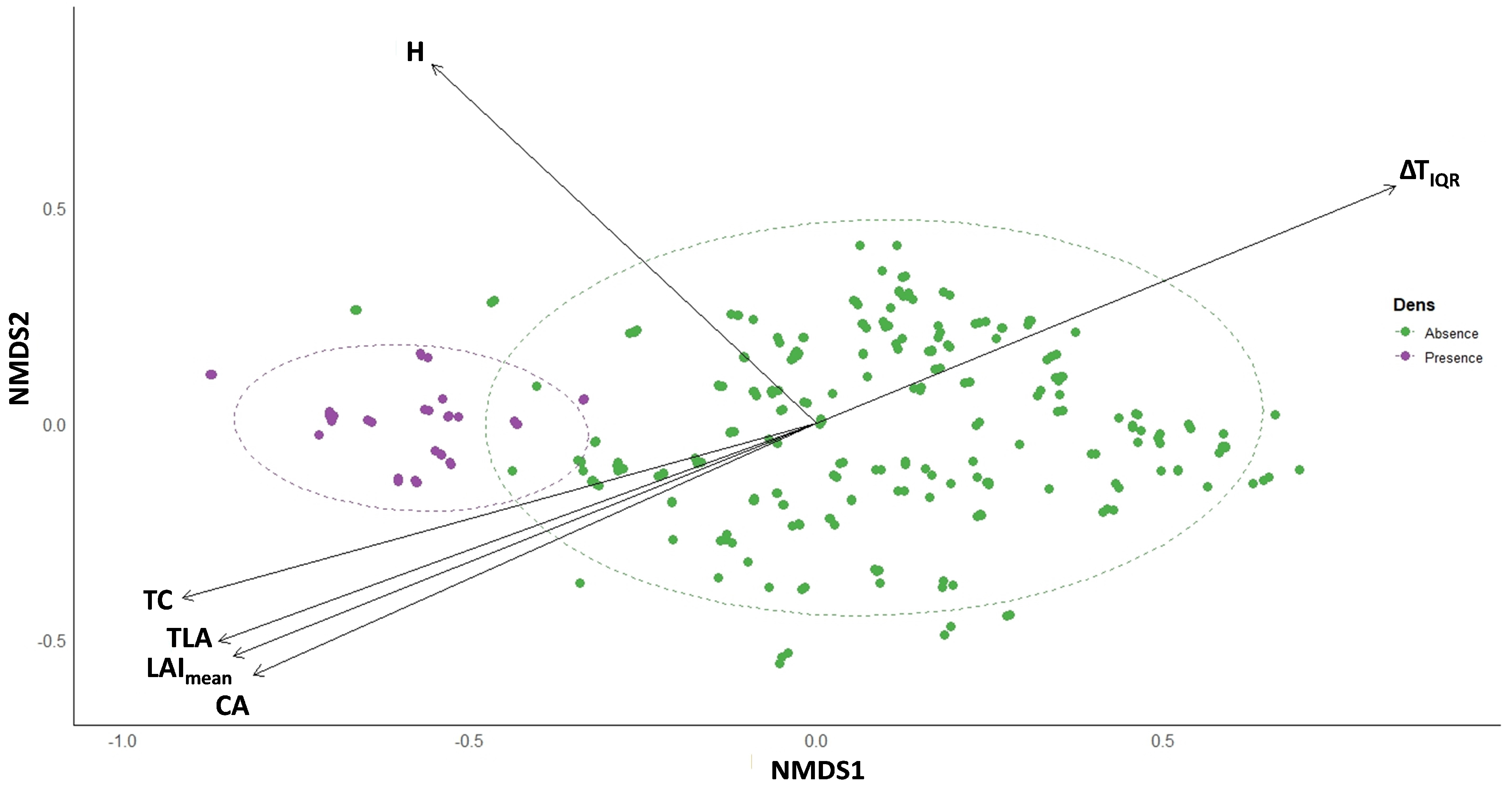 S. anomalus ultimately reflects the integrated expression of structural, physiological, and thermal attributes acting together rather than in isolation. To examine how these dimensions converge into a coherent ecological signal, we expanded the analysis to a multivariate perspective to determine whether den trees occupy a distinct region within the multidimensional trait space defined by structural, physiological, and thermal metrics. The result of the PERMANOVA demonstrated that den occupancy is not random but reflects a coherent multivariate signature integrating structural, physiological, and thermal dimensions. The NMDS ordination provides a visualization of this pattern: den trees cluster within a specific region of multivariate space defined by high tree height, large crown and total leaf area, elevated chlorophyll content, and low trunk thermal asymmetry. These axes collectively describe a pattern of structural dominance and physiological vitality coupled with thermal coherence; these conditions that together define the “functional optimum” for den occupancy. The orientation of ΔT