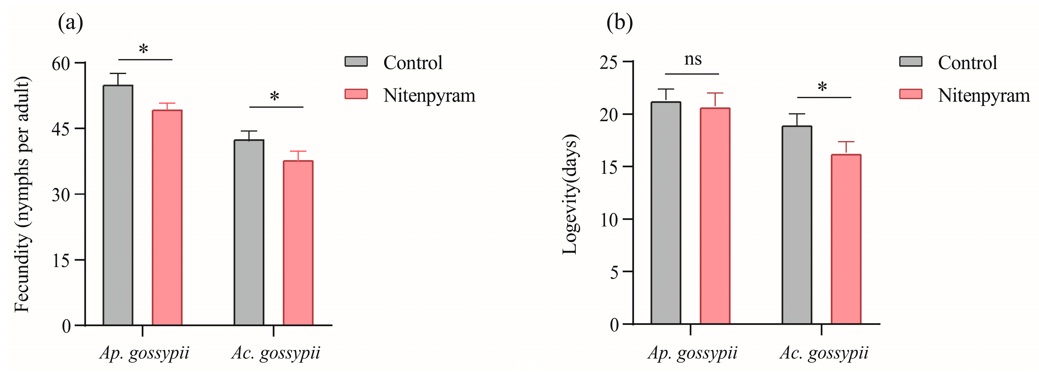 2.3. Sublethal Effects of Nitenpyram on Aphis gossypii and Acyrthosiphon gossypii