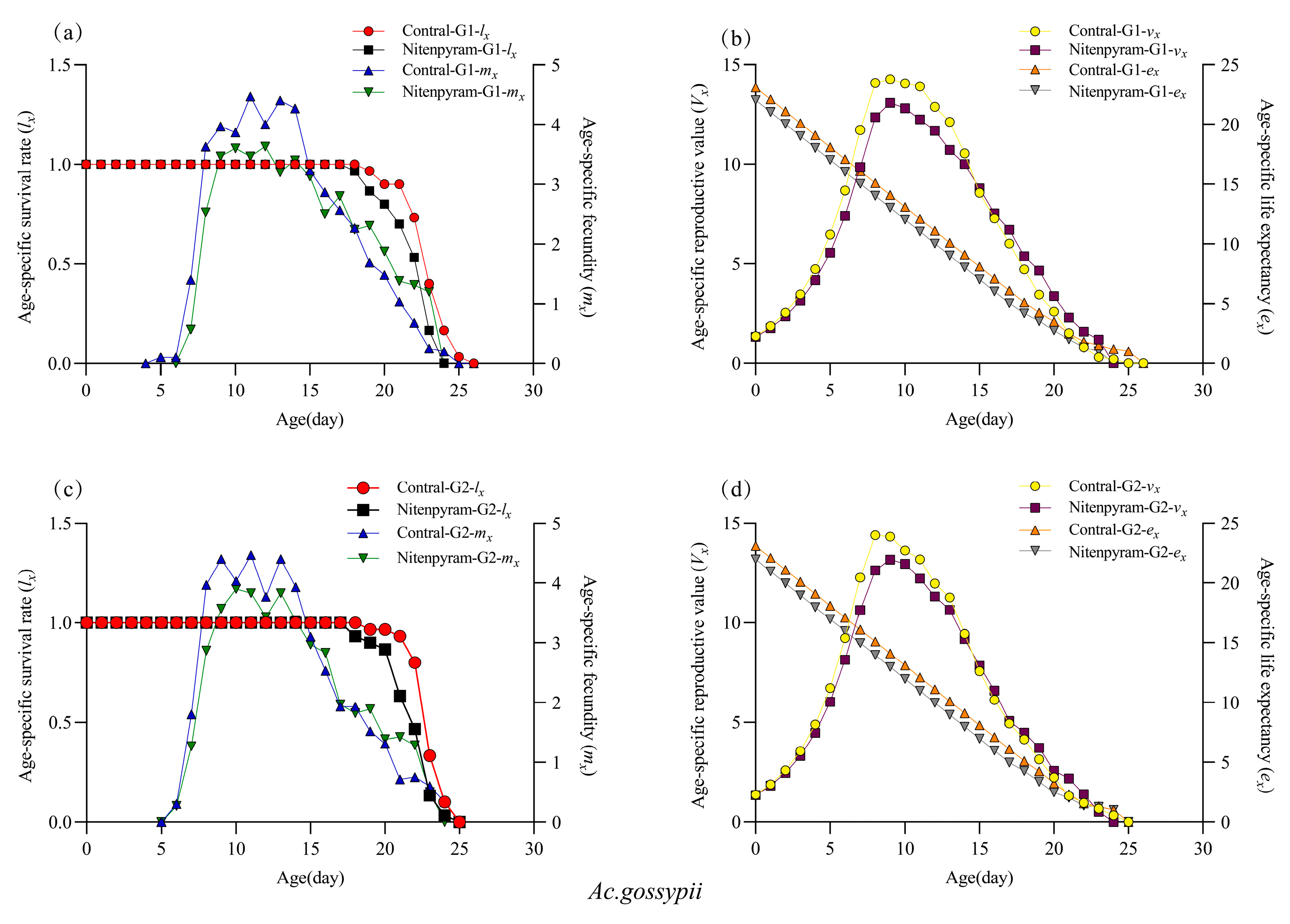 | Parameters | Ap. gossypii-G1 | Ac. gossypii-G1 | Ap. gossypii-G2 | Ac. gossypii-G2 | ||||||||